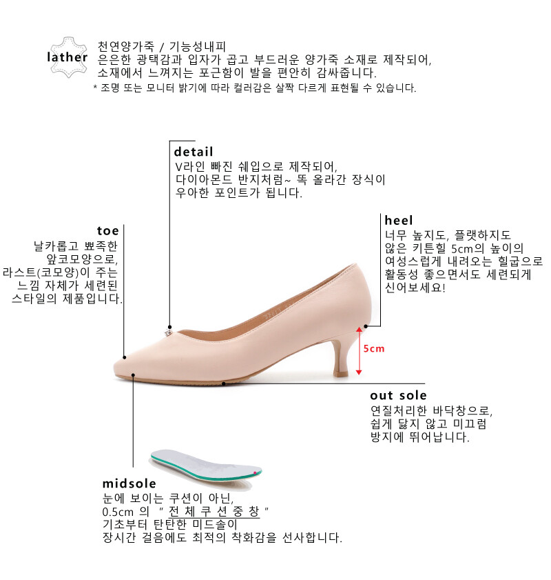COMMENT 세련된 V쉐입에 다이아몬드 느낌으로 똑~ 올라간 펌프스를 소개해드려요! 은은한 광택감과 입자가 곱고 부드러운 양가죽 소재로 제작되어, 소재에서 느껴지는 포근함이 발을 편안히 감싸줍니다. (보다 힘이 있고 매트한소재를 원하시는 분들은 소가죽으로 변경해주세요!) 다이아몬드 반치처럼~ V라인으로 제작되어, 다이아몬드처럼 똑 올라간 장식이 우아한 포인트가 됩니다. 날카롭고 뾰족한 앞코모양으로, 라스트(코모양)이 주는 느낌 자체가 세련된 스타일의 제품입니다. 너무 높지도, 플랫하지도 않은 키튼힐 5cm의 높이로 활동성 좋게 신어보세요! 5cm의 키튼힐 여성스럽게 내려오는 힐굽 5센티의 굽으로 세련되게 즐겨신어보세요. 미끄럼방지 아웃솔 연질처리한 바닥창으로, 쉽게 닳지 않고 미끄럼 방지에 뛰어납니다.
