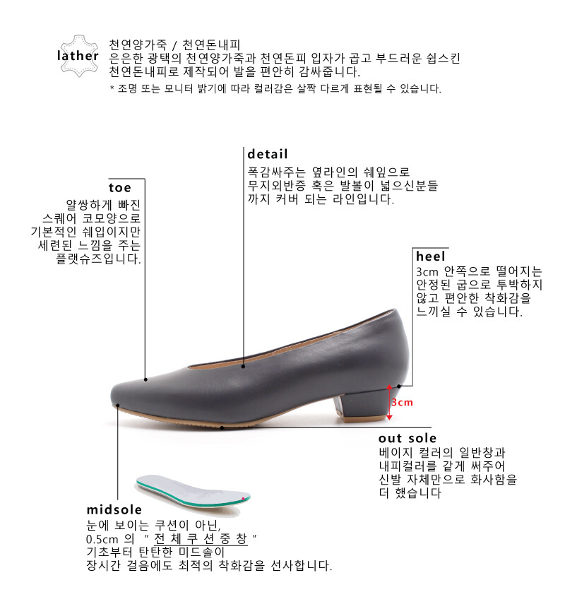 COMMENT 부드러운 가죽이 멋스러운 코모양에 올라가 편하게, 세련되게 즐겨 신으실 수 있는 플랫슈즈입니다. 3센티의 안정된 굽모양이 심플함을 더했고, 발을 감싸주는 쉐입이 더욱 더 편한한 착화감으로 신어주실 수 있습니다. 적당히 빠진 앞코모양으로 세미정장, 캐주얼 두루두루 즐기실 수 있는 코모양이라 생각됩니다. 은은한 컬러들로 구성해 보다 쉽게 즐기실 수 있습니다.