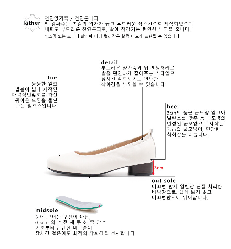 COMMENT 부드러운 양가죽에 폭감기는 쉐입이 편안한 착화감이 좋은 펌프스를 소개해드립니다. 둥글둥글한 앞코모양만으로 포인트가 되는 귀여운 펌프스입니다. 3센티의 안정된 높이감과, 발볼이 여유롭게 느껴지는 볼치수의 펌프스 입니다. 밴딩처리로 발을 편안하게 잡아주는 스타일로, 장시간 착화시에도 편안한 착화감을 느끼실 수 있습니다. 화사한 봄컬러로 즐겨보세요 : )