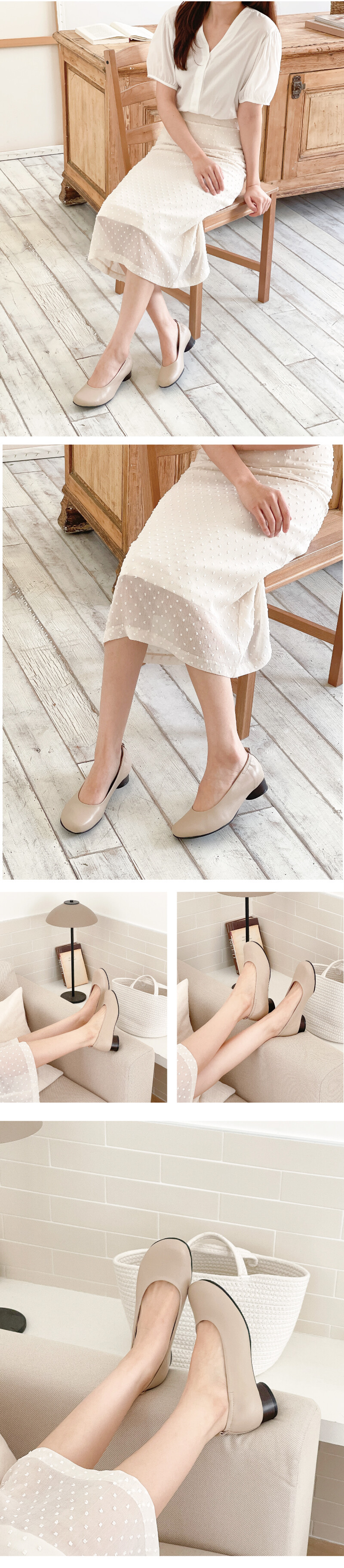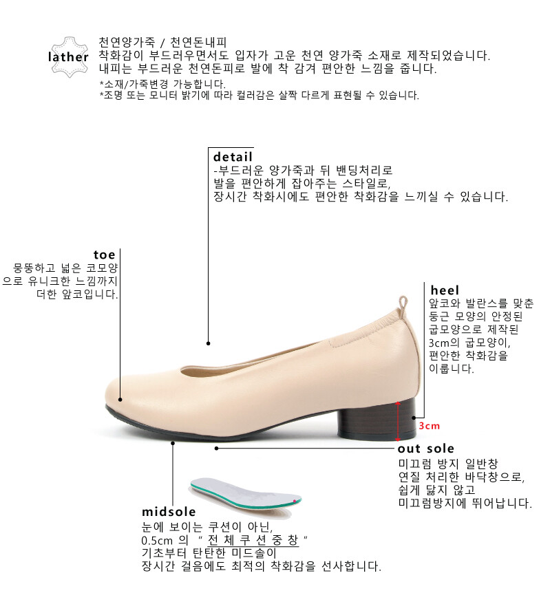 COMMENT 둥그런 앞코가 귀여운 3센티의 플랫 펌프스를 소개해드려요. 착화감이 부드러우면서도 입자가 고운 천연 양가죽 소재로 제작되었습니다. 내피는 부드러운 천연돈피로 발에 착 감겨 편안한 느낌을 줍니다. 발을 폭 덮어주는 라인 발을 감싸주는 라인으로 무지외반증이나, 항상 옆라인이 걸리셨던 분들에겐 너무나도 추천해드리는 디자인입니다! 편하게 신으실 수 있으실 거에요! 부드러운 양가죽과 뒤 밴딩처리로 발을 편안하게 잡아주는 스타일로, 장시간 착화시에도 편안한 착화감을 느끼실 수 있습니다. ( 잘 벗겨지시는 분들에겐 따봉~ ) 앞코와 발란스를 맞춘 둥근 모양의 안정된 굽모양으로 제작된 3cm의 굽모양이, 편안한 착화감을 이룹니다. 미끄럼 방지 일반창 연질 처리한 바닥창으로, 쉽게 닳지 않고 미끄럼방지에 뛰어납니다.