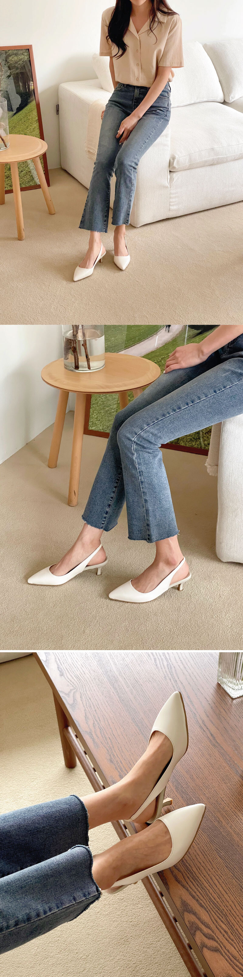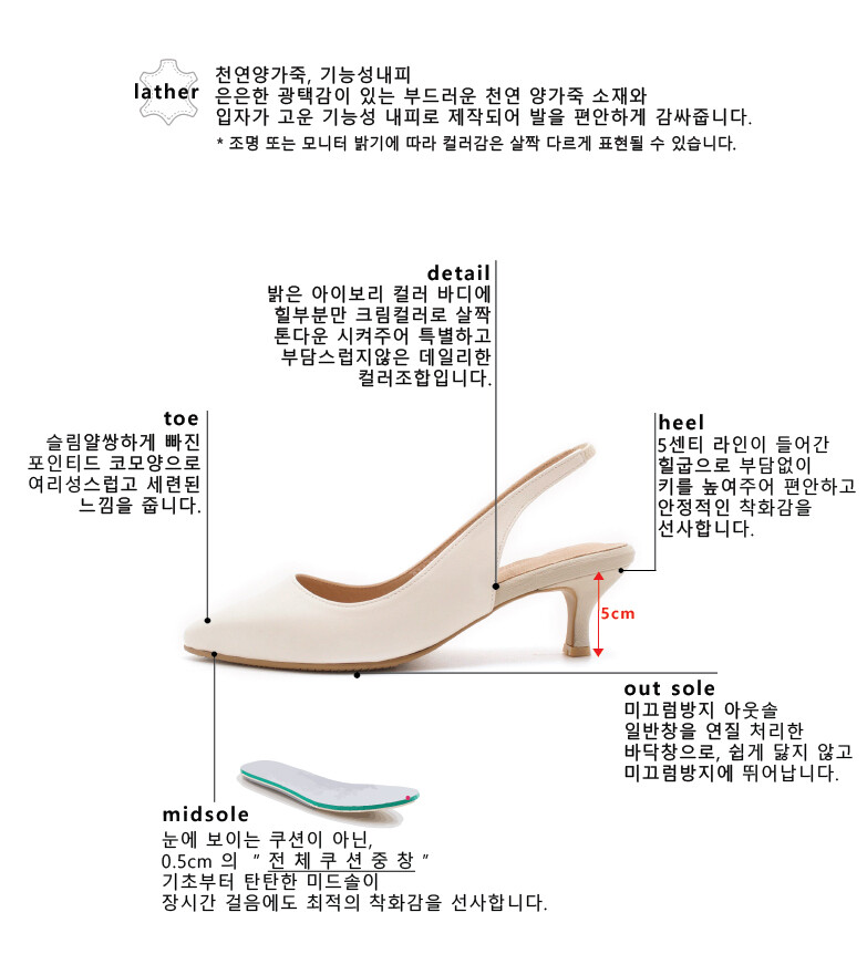 봄시즌 오알의 슬링백 매출 1위인 "샐리 투톤스틸레토 슬링백" 에 크림버전이 드디어 출시했습니다. 기존에 있던 제품은 확연하게 보이는 컬러조합을 주었다면 전체적으로 밝은 아이보리컬러에 힐 부분만 살짝 톤다운을 시켜 전혀 부담스럽지않은 크림 컬러조합을 추가하였습니다. 부분적인 스웨이드가 아닌 오직 천연 양가죽으로 제작되어 부드러움은 기본!! 은은하게 흐르는 광택감이 아주 고급스러운 제품입니다.청바지와 원피스 어떤 코디에 착화하셔도 멋스럽게 착화 하실 수있으며 데일리로 신기에 너무 좋은 슬링백입니다.