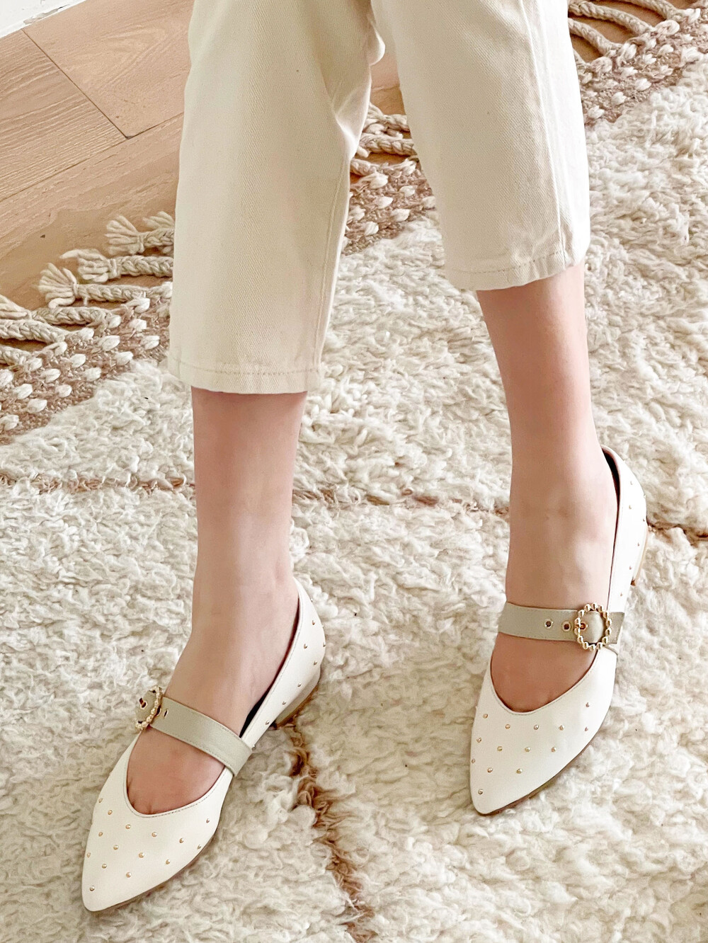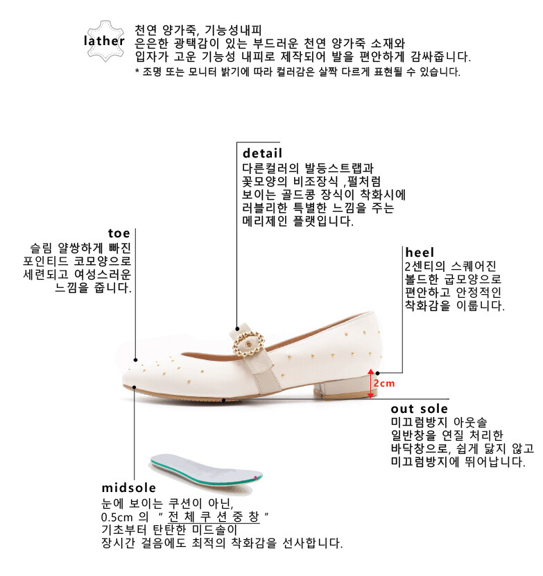 바디 컬러와 다른 컬러의 발등스트랩과 꽃을연상케하는비조장식이 포인트인 귀여운 느낌의 메리제인 플랫슈즈입니다.바디 전체에 펄처럼 보이는 골드콩 장식을 디자인하여 은은하게 포인트를 주었으며 포인티드 앞코로 세련된 느낌을 연출하실 수 있습니다. 그리고 부드러운 양가죽과 입자가 고운 기능성내피로 제작하여 착화시 발을 포옥~감싸주는 플랫슈즈입니다.