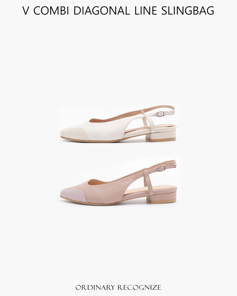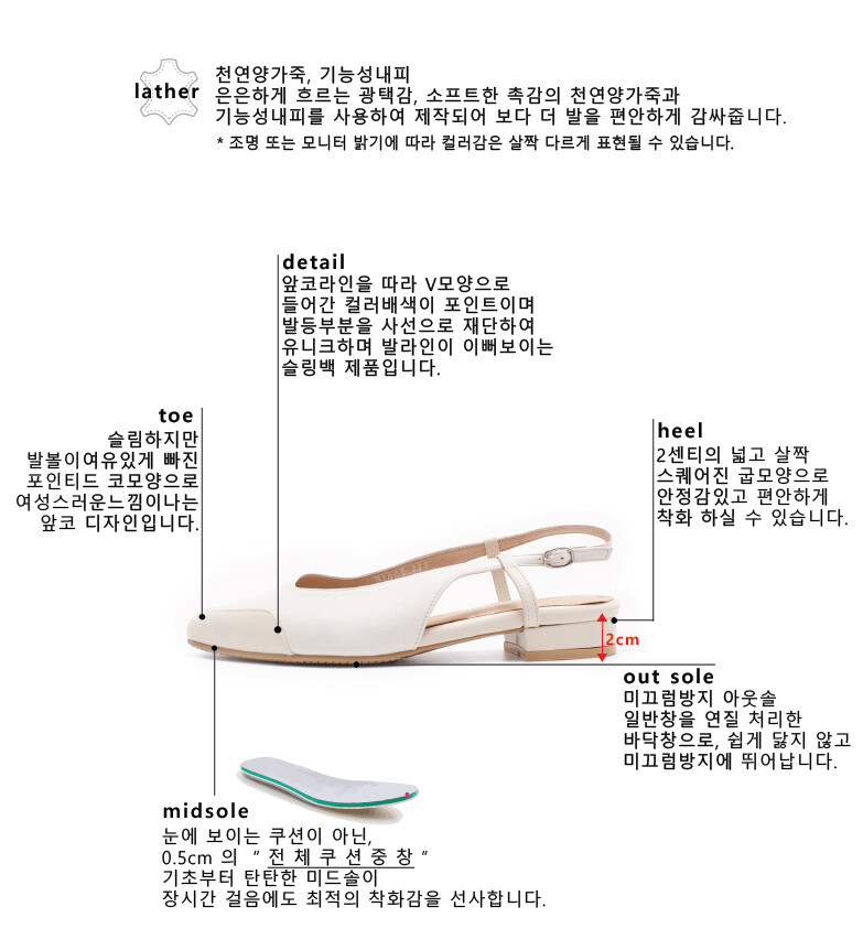 COMMENT 발볼부분이 여유있게 디자인된 포인티드 앞코에 V모양으로 들어간 컬러배색이 유니크한 슬링백 제품입니다. 베이직한 아이보리컬러에 베이지컬러로 컬러배색이 들어가 흔하지 않으면서 데일리하게 제작되었으며, 발등부분을 사선라인으로 재단하여 세련된 느낌을 주는 제품입니다. 발을 따라 이어지는 스트랩의 중간부분에 발을 잡아주는 스트랩을 디자인하여 착화시 발라인이 더욱 이뻐보이며 한번 더 발을 잡아주기때문에 편하게 착화 하실 수 있는 슬링백입니다.