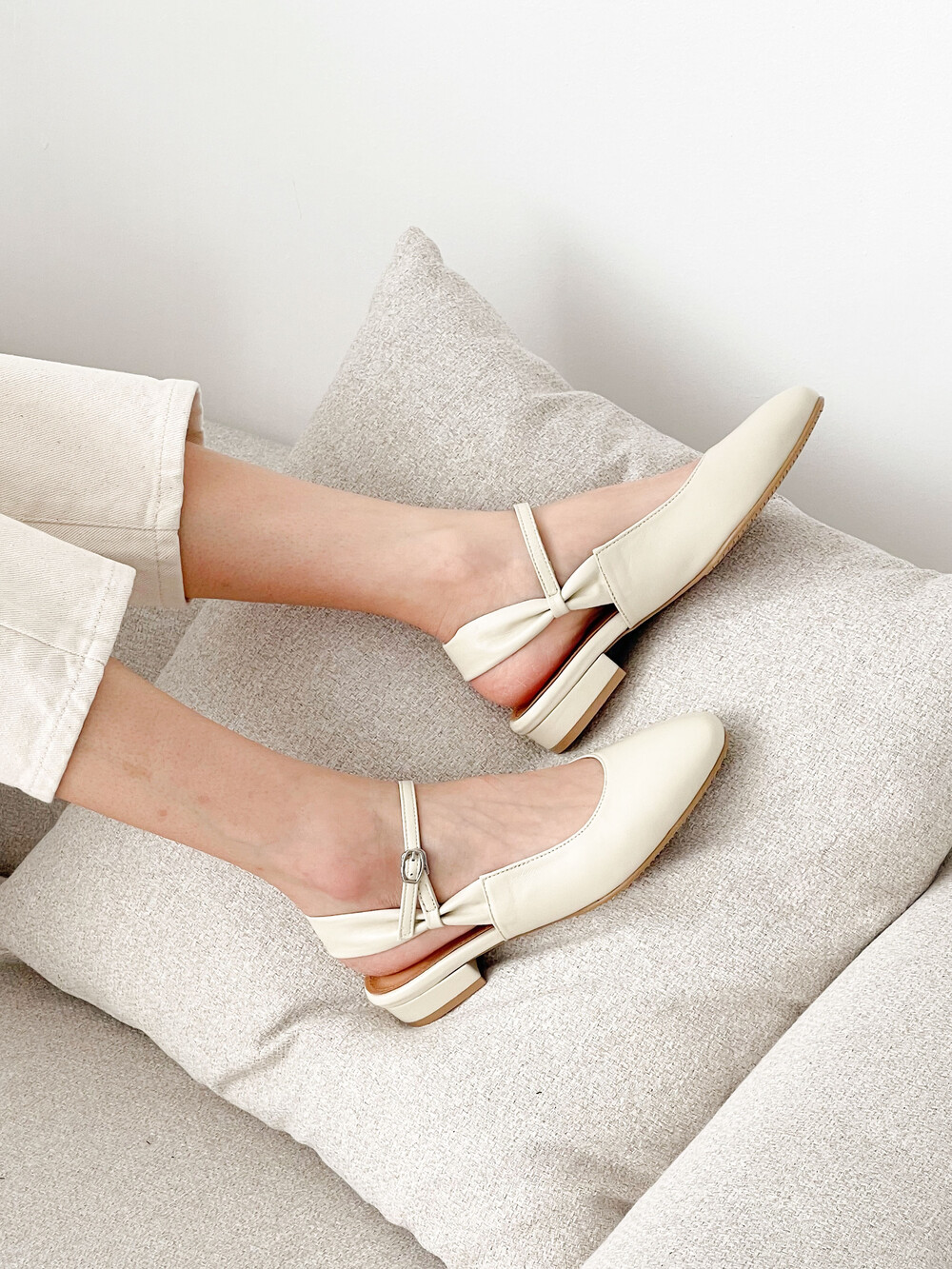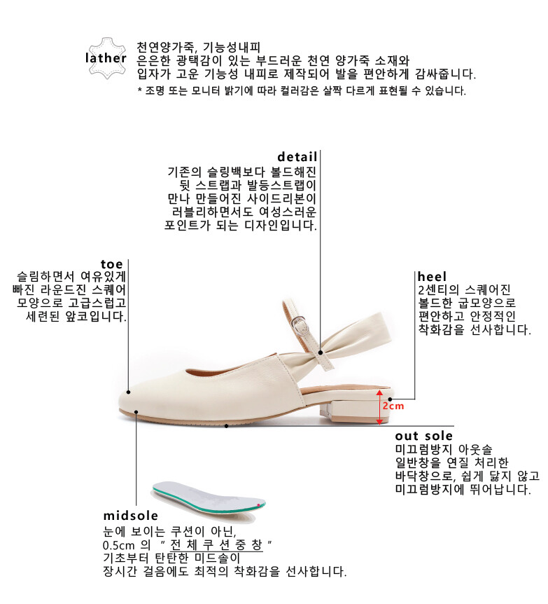 기존에 슬링백 디자인들과는 다르게 발 뒷부분을 감싸는 볼드한 스트랩과사이드에 리본이 포인트인 제품입니다. 메리제인에서 볼수있는 발등을 가로지르는 스트랩을디자인하여 여성스럽고 발이 여리여리해보이는 시각적 효과를주며 소재 또한 천연 양가죽을 사용하여 부드럽게 발에 착화 하실 수 있습니다. 전체적인 느낌자체가 세련되었고 베이직한 아이보리컬러로 부담없이착화 하시기 좋은 오알의 슬링백입니다.