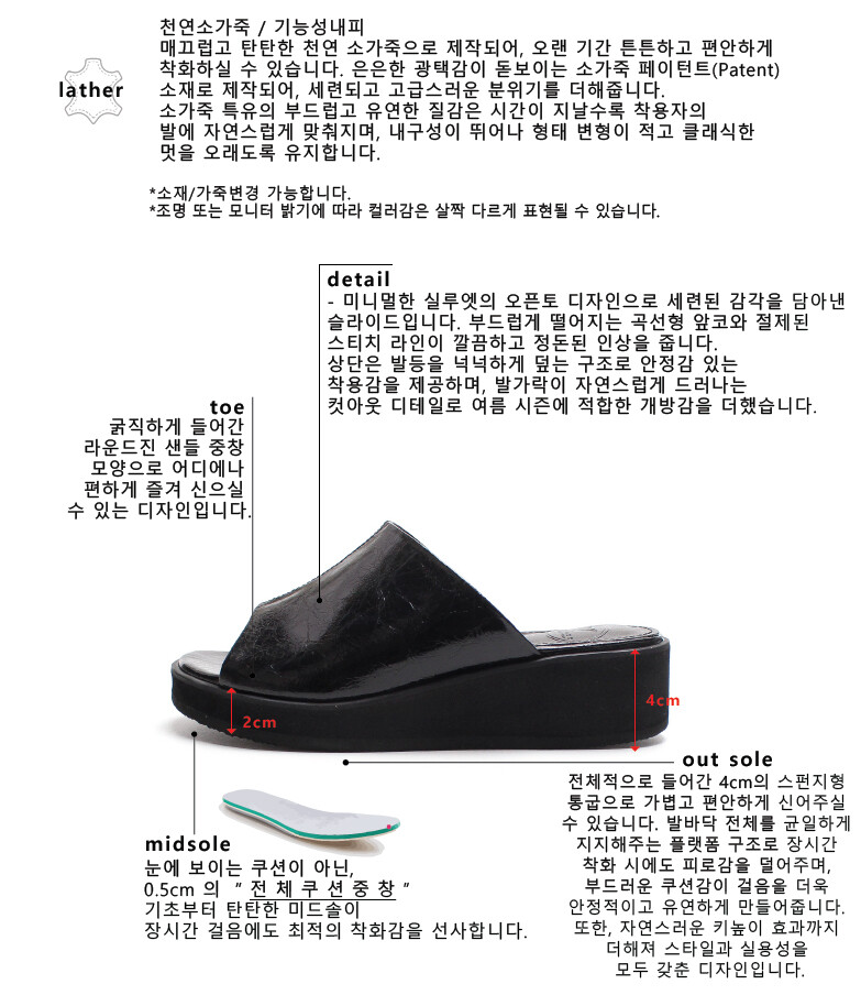 COMMENT 매끄럽고 탄탄한 천연 소가죽으로 제작되어, 오랜 기간 튼튼하고 편안하게 착화하실 수 있습니다. 은은한 광택감이 돋보이는 소가죽 페이턴트(Patent) 소재로 제작되어, 세련되고 고급스러운 분위기를 더해줍니다. 소가죽 특유의 부드럽고 유연한 질감은 시간이 지날수록 착용자의 발에 자연스럽게 맞춰지며, 내구성이 뛰어나 형태 변형이 적고 클래식한 멋을 오래도록 유지합니다. 굵직하게 들어간 라운드진 샌들 중창 모양으로 어디에나 편하게 즐겨 신으실 수 있는 디자인입니다. 굵직하게 들어간 라운드진 샌들 중창 모양으로 어디에나 편하게 즐겨 신으실 수 있는 디자인입니다. 부드럽게 말아올려진 앞코 라인은 발가락을 편안하게 감싸주며, 캐주얼한 룩부터 모던한 스타일까지 두루 어울려 데일리 아이템으로 활용도가 높습니다. 심플하면서도 존재감 있는 실루엣으로, 다양한 착장에 멋스럽게 매치하실 수 있습니다. 미니멀한 실루엣의 오픈토 디자인으로 세련된 감각을 담아낸 슬라이드입니다. 부드럽게 떨어지는 곡선형 앞코와 절제된 스티치 라인이 깔끔하고 정돈된 인상을 줍니다. 상단은 발등을 넉넉하게 덮는 구조로 안정감 있는 착용감을 제공하며, 발가락이 자연스럽게 드러나는 컷아웃 디테일로 여름 시즌에 적합한 개방감을 더했습니다. 전체적으로 들어간 4cm의 스펀지형 통굽으로 가볍고 편안하게 신어주실 수 있습니다. 발바닥 전체를 균일하게 지지해주는 플랫폼 구조로 장시간 착화 시에도 피로감을 덜어주며, 부드러운 쿠션감이 걸음을 더욱 안정적이고 유연하게 만들어줍니다. 또한, 자연스러운 키높이 효과까지 더해져 스타일과 실용성을 모두 갖춘 디자인입니다.
