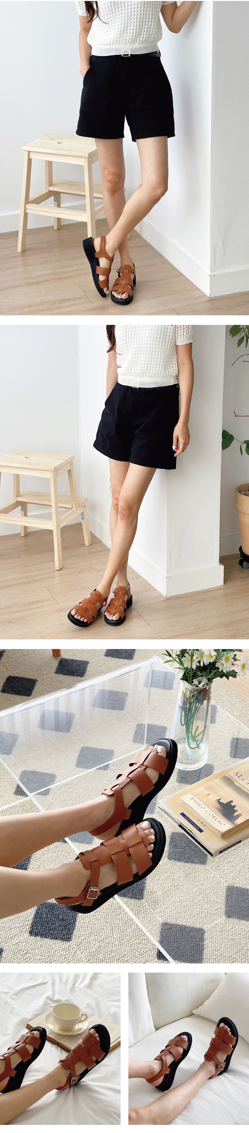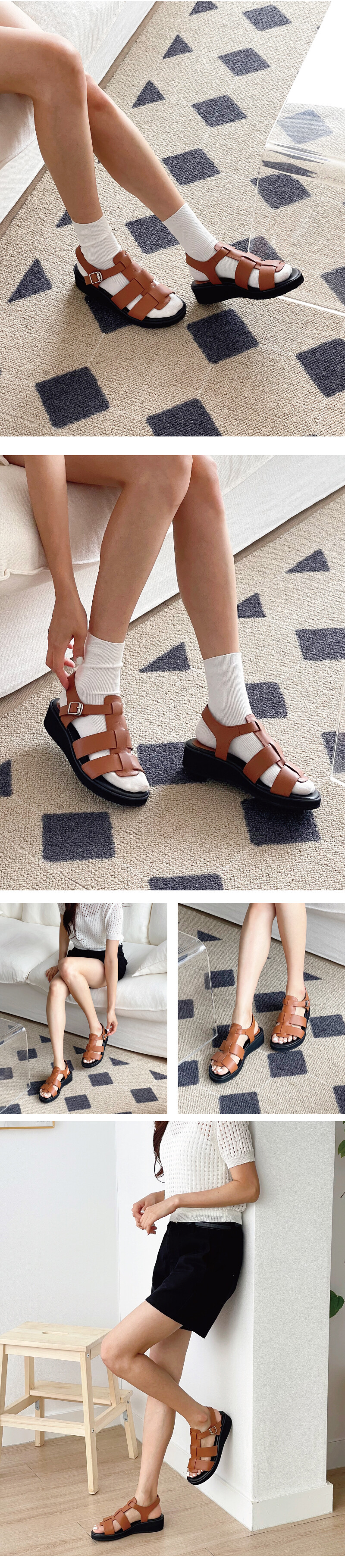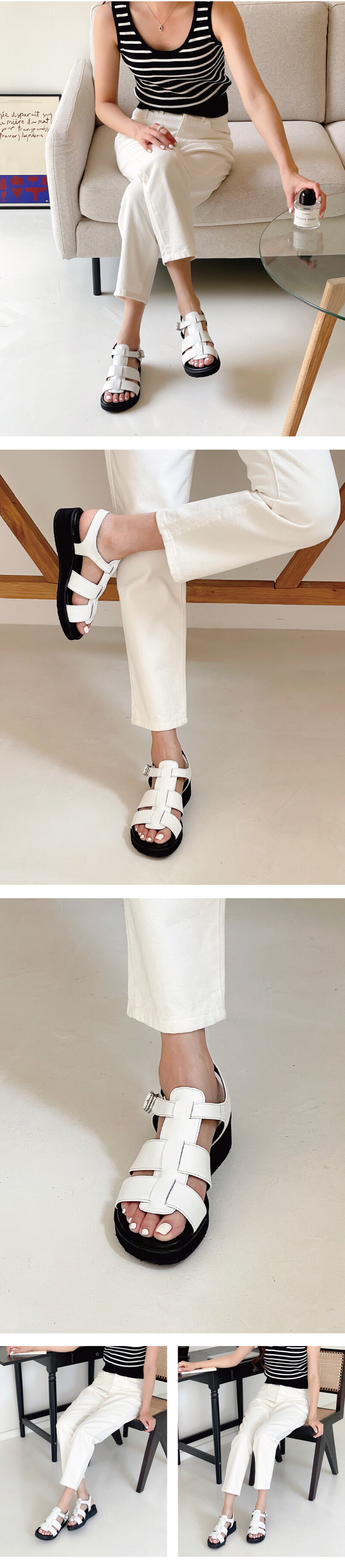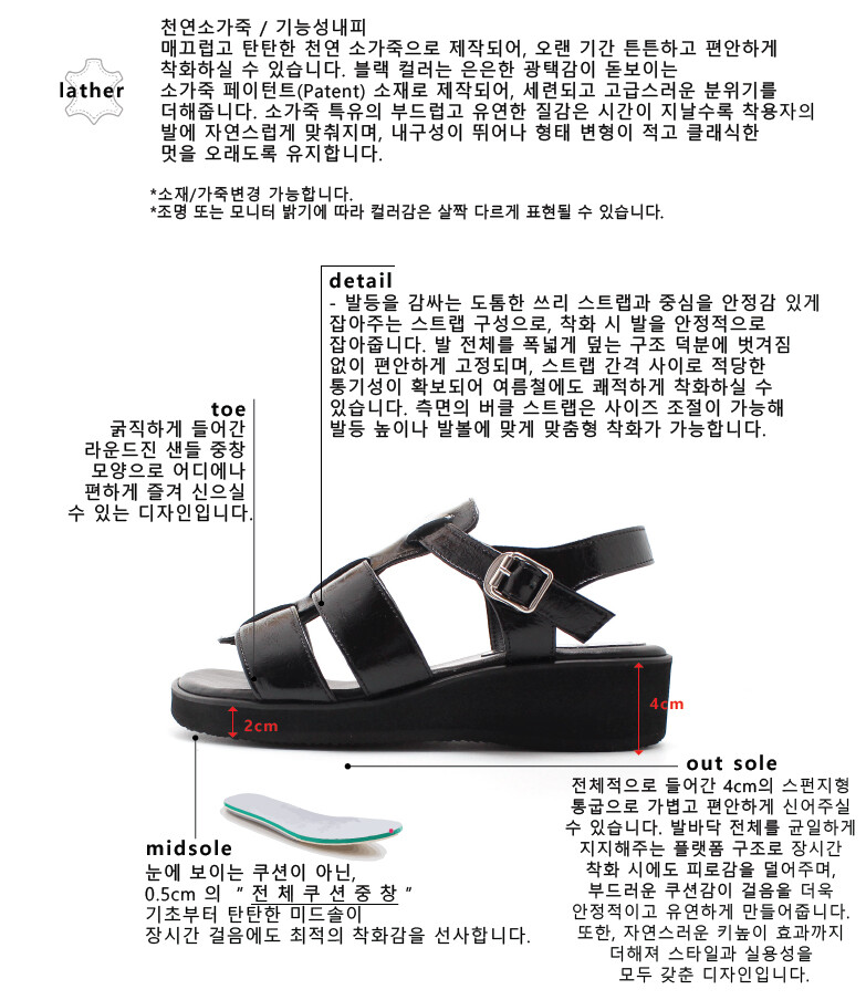 COMMENT 세 줄 스트랩이 발등을 감싸는 구조적인 실루엣과 라운드형 앞코가 조화를 이루는, 편안함과 스타일을 동시에 갖춘 샌들 디자인입니다. 매끄럽고 탄탄한 천연 소가죽으로 제작되어, 오랜 기간 튼튼하고 편안하게 착화하실 수 있습니다. 블랙 컬러는 은은한 광택감이 돋보이는 소가죽 페이턴트(Patent) 소재로 제작되어, 세련되고 고급스러운 분위기를 더해줍니다. 소가죽 특유의 부드럽고 유연한 질감은 시간이 지날수록 착용자의 발에 자연스럽게 맞춰지며, 내구성이 뛰어나 형태 변형이 적고 클래식한 멋을 오래도록 유지합니다. 굵직하게 들어간 라운드진 샌들 중창 모양으로 어디에나 편하게 즐겨 신으실 수 있는 디자인입니다. 부드럽게 말아올려진 앞코 라인은 발가락을 편안하게 감싸주며, 캐주얼한 룩부터 모던한 스타일까지 두루 어울려 데일리 아이템으로 활용도가 높습니다. 심플하면서도 존재감 있는 실루엣으로, 다양한 착장에 멋스럽게 매치하실 수 있습니다. 발등을 감싸는 도톰한 쓰리 스트랩과 중심을 안정감 있게 잡아주는 스트랩 구성으로, 착화 시 발을 안정적으로 잡아줍니다. 발 전체를 폭넓게 덮는 구조 덕분에 벗겨짐 없이 편안하게 고정되며, 스트랩 간격 사이로 적당한 통기성이 확보되어 여름철에도 쾌적하게 착화하실 수 있습니다. 측면의 버클 스트랩은 사이즈 조절이 가능해 발등 높이나 발볼에 맞게 맞춤형 착화가 가능합니다. 전체적으로 들어간 4cm의 스펀지형 통굽으로 가볍고 편안하게 신어주실 수 있습니다. 발바닥 전체를 균일하게 지지해주는 플랫폼 구조로 장시간 착화 시에도 피로감을 덜어주며, 부드러운 쿠션감이 걸음을 더욱 안정적이고 유연하게 만들어줍니다. 또한, 자연스러운 키높이 효과까지 더해져 스타일과 실용성을 모두 갖춘 디자인입니다.