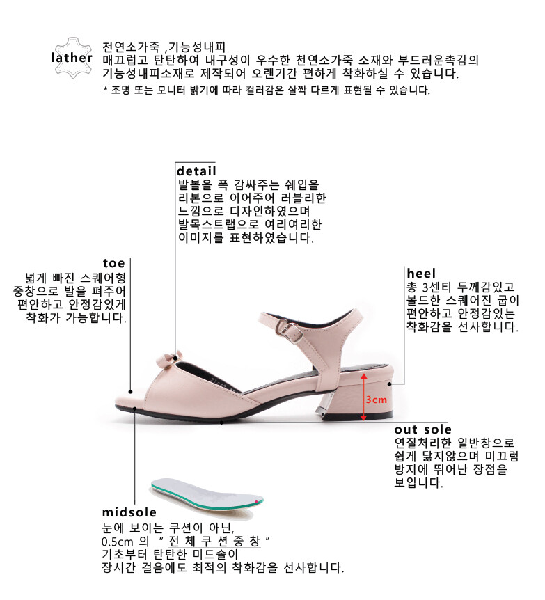우유를 한 방울 똑! 떨어드린 것 같은 컬러감이 매력적인 오알의 신상 샌들입니다. 러블리한 컬러감에 발등 부분에 귀여운 들어간 리본 포인트가 돋보이는 디자인의 제품인데요 발볼 부분은 편히 부드럽게 감싸주는 쉐입을 리본으로 이어주어 러블리함을 표현하였으며 발목부분에 얇은 스트랩을 디자인하여 여리여리한 분위기를 연출하실 수 있습니다.내구성이 탄탄한 천연소가죽 소재로 오랫동안 튼튼하게 착화하실 수 있으며 편안하고 안정감있는 착화감을 느끼실 수 있는 샌들로 추천해 드리는 제품입니다.