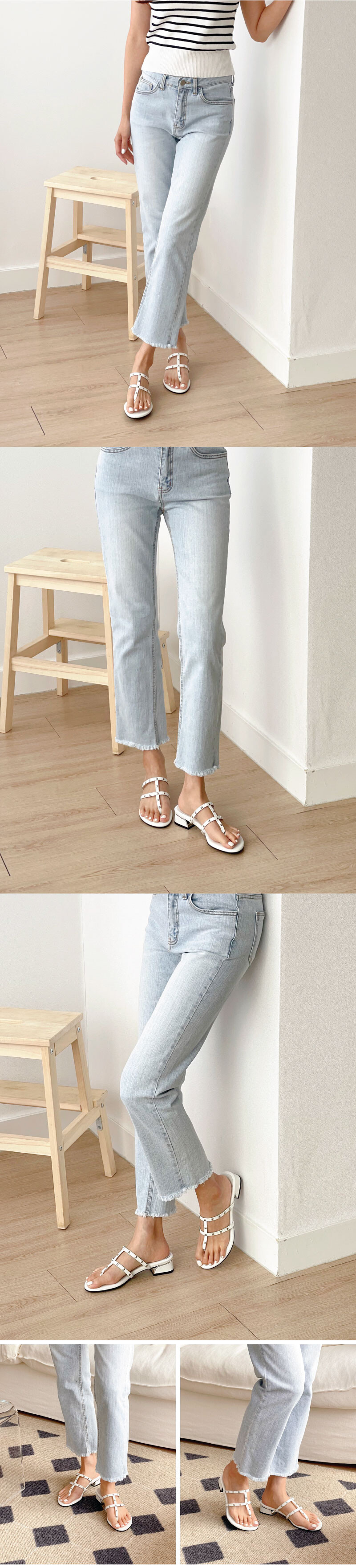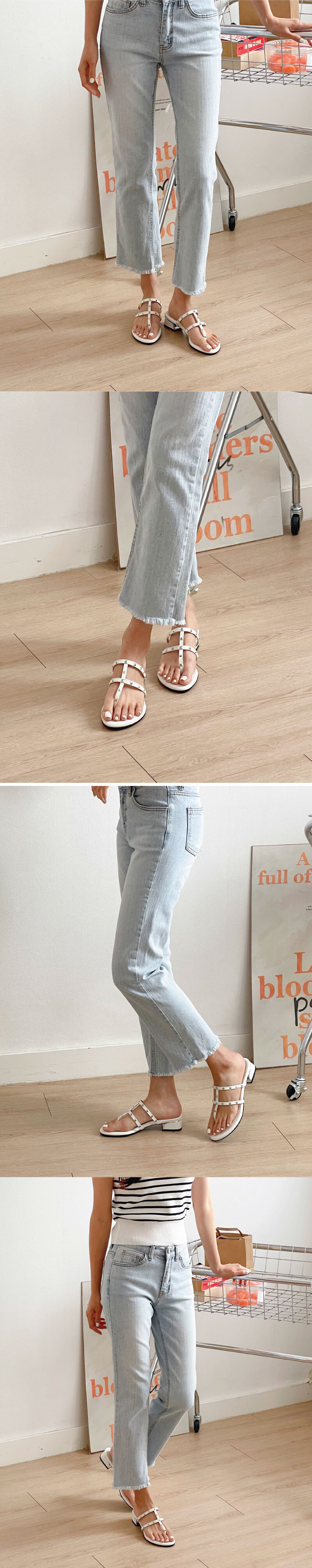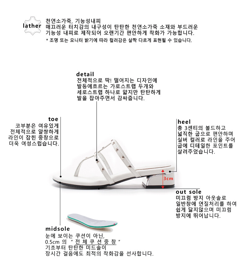 전체적으로 클린한 컬러에 얇은 스트랩으로만 이루어진 쪼리 뮬 제품입니다. 스트랩으로만 이루어진 디자인이지만 발등을 감싸는 두개의 얇은 스트랩과 발등을 가로지는 하나의 얇은 스트랩이 탄탄하게 발을 잡아주며 자칫 밋밋할 수 있는 스트랩에 실버 스퀘어 스터드를 콕콕 박아서 포인트를 준 제품이랍니다.3센티의 볼드하고 안정적인 굽에 실버 컬러로 라인을 주어 포인트를 주었습니다.실버 컬러와 만나 시원해 보이는 시각적 효과를 주며 부담스럽지 않은 디자인으로 어디에든 잘 어울리는 착화감을 선사합니다.