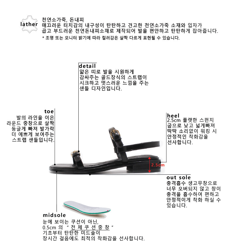COMMENT 매끈하고 튼튼한 소가죽으로 제작된 샌들로, 부드러운 돈내피와 함께써준 제품입니다. 은은한 광택의 텍스쳐가 멋스러운 소재입니다. 얇은 띠로 발을 시원하게 감싸주는 골드장식의 스트랩이 시크하고 멋스러운 느낌을 주며, 샌들의 모양을 좌지우지하는 바닥모양이 넓은면적의 라운드모양으로 빠져 발이 편하게 펴지는 샌들입니다. 2.5cm의 스폰지아웃솔 딱딱소리없이 신을수 있는 견고한 스폰지 창으로 제작되어 편안한 착화감을 느끼실 수 있습니다.