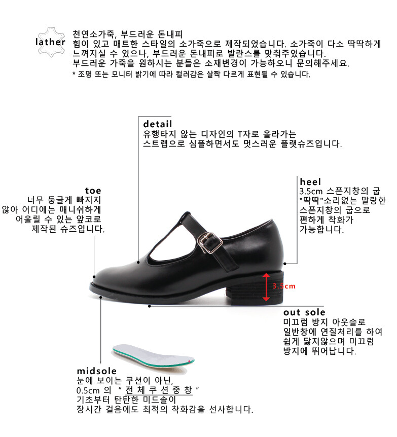 COMMENT 힘이 있고 매트한 스타일의 소가죽으로 제작된 플랫입니다. 소가죽이 다소 딱딱하게 느껴지실 수 있으나, 부드러운 돈내피로 발란스를 맞춰주었습니다. (*부드러운 가죽을 원하시는 분들은 소재변경이 가능하오니 문의해주세요.) 너무 둥글게 빠지지 않아 어디에는 매니쉬하게 어울릴 수 있는 앞코로 제작된 슈즈입니다. 유행타지 않는 디자인의 T자로 올라가는 스트랩으로 심플하면서도 멋스러운 플랫슈즈로 4mm정도의 세피창이 유니크한 멋을 만들어냅니다. 3.5cm 스폰지창의 굽 "딱딱"소리없는 말랑한 스폰지창의 굽으로 편하게 착화가 가능합니다 .