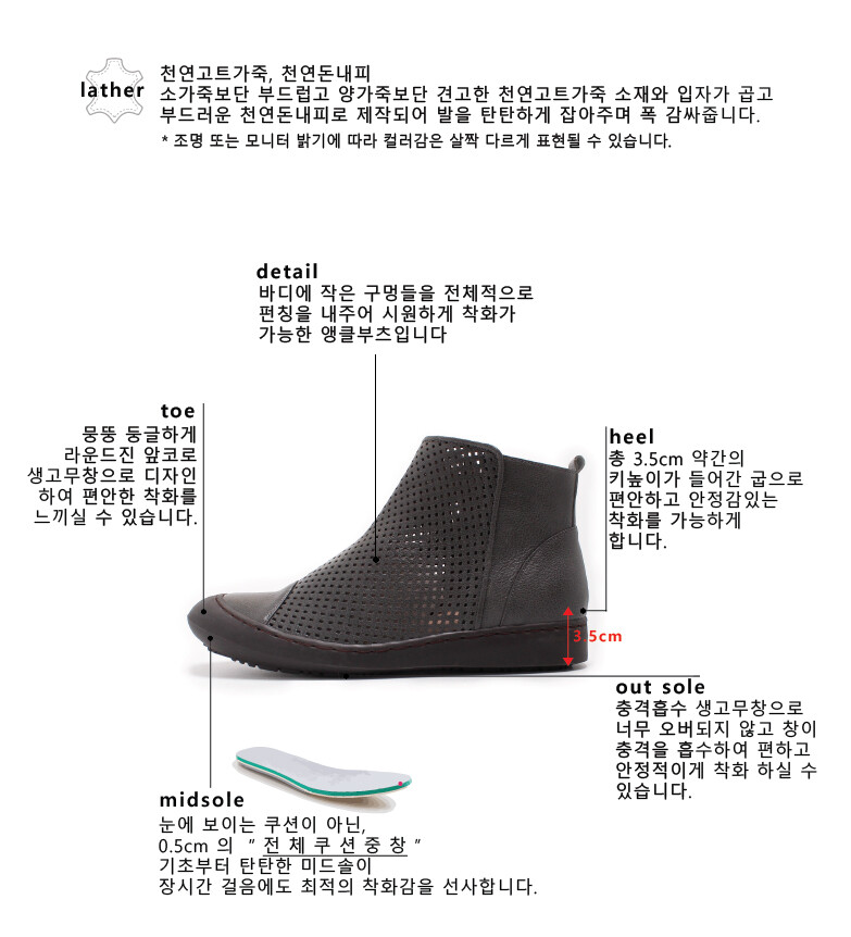 COMMENT 부드럽고 튼튼한 고트가죽소재 소가죽보다 부드럽고 양가죽보단 견고한 천연 고트가죽으로 제작된 로퍼입니다. 내피도 돈내피로 제작되어 편안한 착화감을 느끼실 수 있습니다. 바디전체에 펀칭 작은 구멍으로 바디전체를 펀칭내주어 시원한 앵클부츠입니다. 라운드진 앞코로 편안한 착화감을 느끼실 수 있는 부츠입니다. 앞코까지 올라온 생고무창이 앞코 까짐을 보호해주는 역활까지 해주는 부츠!