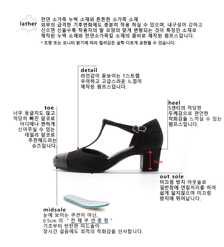 COMMENT 외부의 급격한 기후변화에도 충분히 착용 하실 수 있으며, 내구성이 강하고 신으면 신을수록 착용자의 발 모양의 맞게 변형되는 것이 특징인 소재로 제작된 누벅 소재와 천연소가죽킾 소재의 콤비로 제작된 펌프스입니다. 너무 둥글지도 않고 적당히 빠진 앞코로 어디에나 편하게 신어주실 수 있는 데일리 앞코로 추천해드리는 슈즈입니다. 앞코부분 콤비된 패턴으로 발이 작아보이는 효과까지~~! 우아하고 고급스러운 느낌이 돋보이는 T스트랩 라인으로 제작되었으며, 5센티의 적당한 두께감으로 편안한 착화감을 느끼실 수 있는 펌프스입니다.