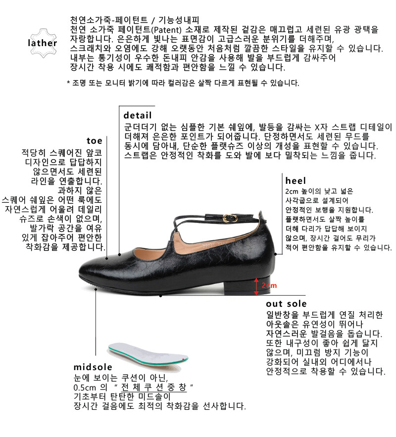 COMMENT 엣지있는 크로스 스트랩이 멋스러운 플랫슈즈를 소개합니다! 천연 소가죽 페이턴트(Patent) 소재로 제작된 겉감은 매끄럽고 세련된 유광 광택을 자랑합니다. 은은하게 빛나는 표면감이 고급스러운 분위기를 더해주며, 스크래치와 오염에도 강해 오랫동안 처음처럼 깔끔한 스타일을 유지할 수 있습니다. 내부는 통기성이 우수한 돈내피 안감을 사용해 발을 부드럽게 감싸주어 장시간 착용 시에도 쾌적함과 편안함을 느낄 수 있습니다. 적당히 스퀘어진 앞코 디자인으로 답답하지 않으면서도 세련된 라인을 연출합니다. 과하지 않은 스퀘어 쉐잎은 어떤 룩에도 자연스럽게 어울려 데일리 슈즈로 손색이 없으며, 발가락 공간을 여유 있게 잡아주어 편안한 착화감을 제공합니다. 군더더기 없는 심플한 기본 쉐잎에, 발등을 감싸는 X자 스트랩 디테일이 더해져 은은한 포인트가 되어줍니다. 단정하면서도 세련된 무드를 동시에 담아내, 단순한 플랫슈즈 이상의 개성을 표현할 수 있습니다. 스트랩은 안정적인 착화를 도와 발에 보다 밀착되는 느낌을 줍니다. 2cm 높이의 낮고 넓은 사각굽으로 설계되어 안정적인 보행을 지원합니다. 플랫하면서도 살짝 높이를 더해 다리가 답답해 보이지 않으며, 장시간 걸어도 무리가 적어 편안함을 유지할 수 있습니다. 일반창을 부드럽게 연질 처리한 아웃솔은 유연성이 뛰어나 자연스러운 발걸음을 돕습니다. 또한 내구성이 좋아 쉽게 닳지 않으며, 미끄럼 방지 기능이 강화되어 실내외 어디에서나 안정적으로 착용할 수 있습니다.