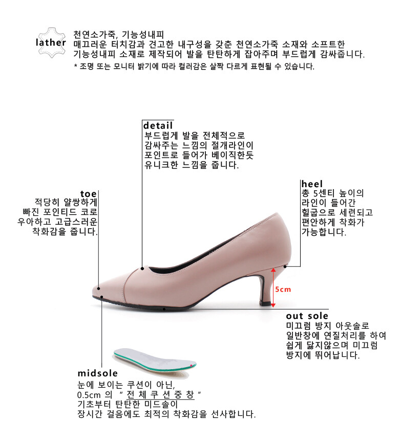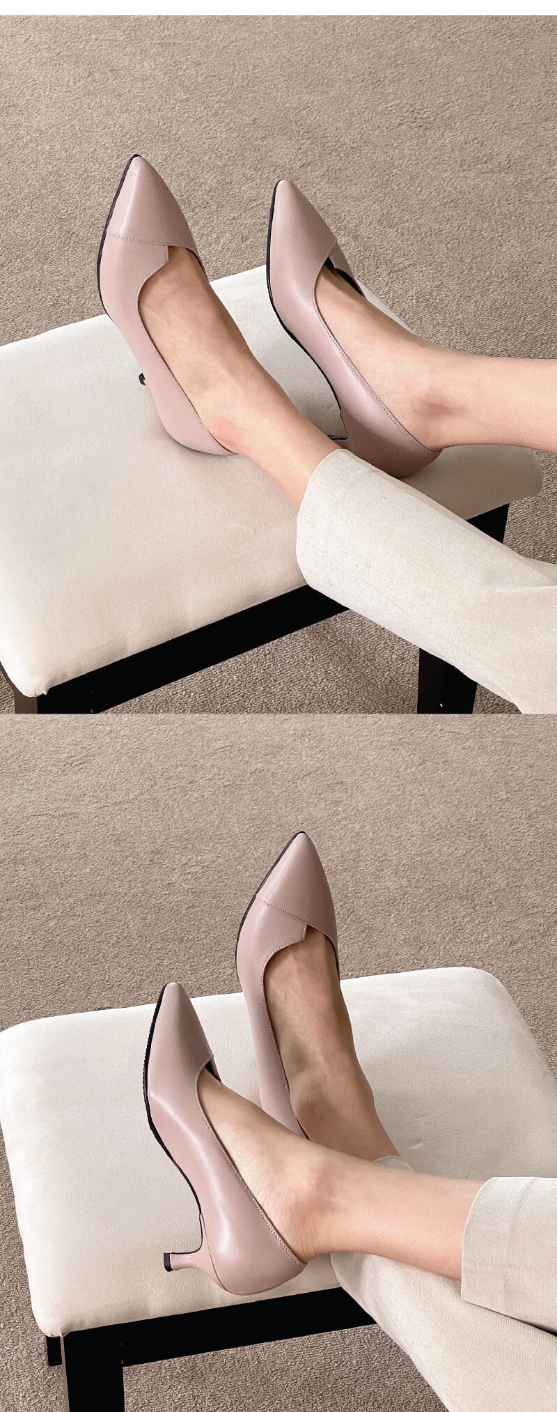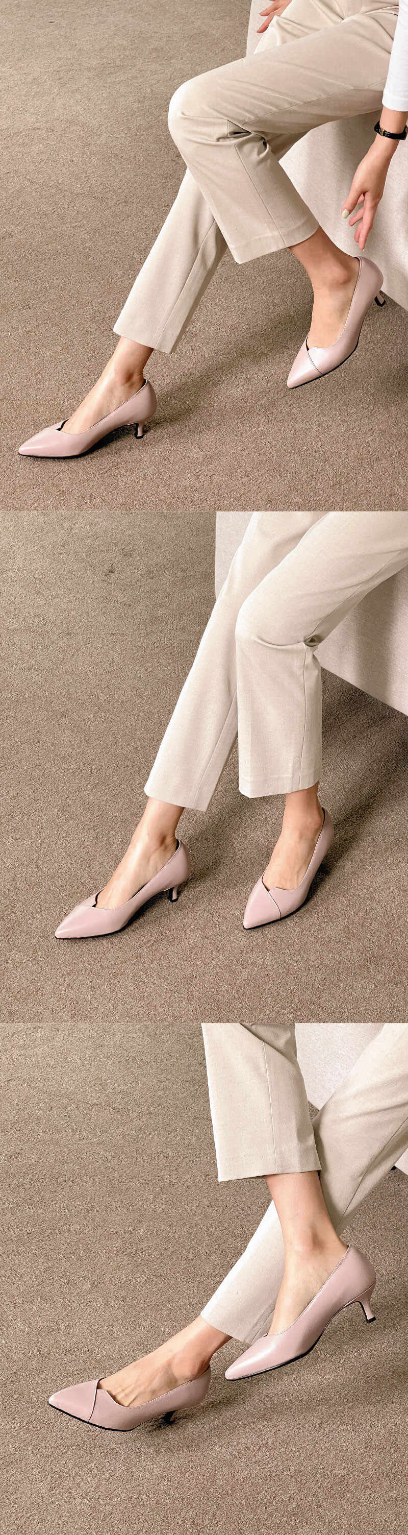 매끄러운 터치감의 탄탄 천연 소가죽 소재로 제작된 펌프스입니다. 여유있고 얄쌍하게빠진 포인티드 앞코 모양이착화시 발이 더욱 여리해 보이며 이뻐보이는 시각효과를 주며 부드러운 라인감의 절개로 포인트를 주어 디자인, 제작하였습니다. 가을을 느낄 수 있는 가을과 어울리는 MLBB 빛 웜한 컬러로 제작되어 데일리 코디에 포인트를 주어착화하기 딱! 좋고 높지않은 5센티의 굽으로 안정적이고 편안하게 착화해보세요~