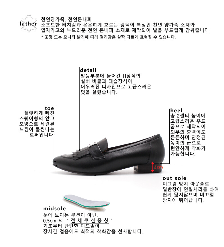 COMMENT 입자가 곱고 부드러운 양가죽으로 제작된 로퍼로 발을 편안히 감싸줍니다. 발등부분에 들어간 H장식의 실버 버클과 태슬장식이 어우러진 디자인으로 고급스러운 멋을 살린 로퍼로, 청바지,원피스,슬랙스 어디에나 즐겨신기에 좋은 스타일로 강추~해드리는 디자인입니다. 고급스러운 진-한 브라운컬러감의 우드 굽(쓰미굽)으로 제작되어 외부충격에도 튼튼한 굽소재입니다. 2센티 높이의 안정된 높이감으로 안정되게 착화하실 수 있는 굽으로 제작되었습니다.
