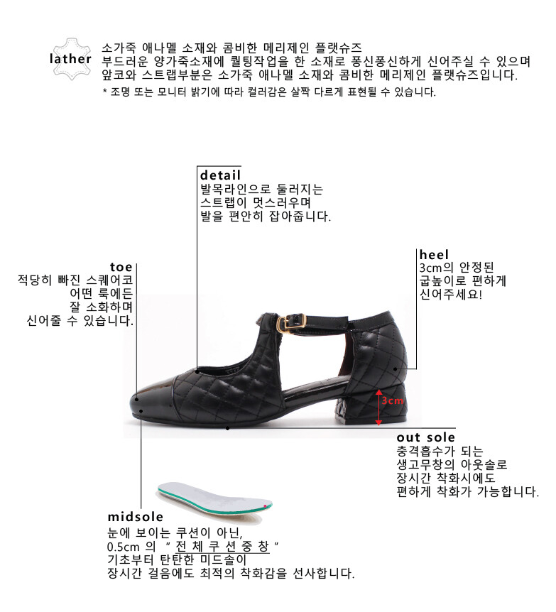 부드러운 양가죽소재에 퀄팅작업을 한 소재로 퐁신퐁신하게 신어주실 수 있으며 앞코와 스트랩부분은 소가죽 애나멜 소재와 콤비한 메리제인 플랫슈즈입니다. 발목으로 둘러지는 메리제인 흔치 않은 쉐입으로 유니크한 느낌의 메리제인 스타일의 플랫슈즈입니다. 발목라인으로 둘러지는 스트랩이 멋스러우며 발을 편안히 잡아줍니다. 적당히 빠진 스퀘어코 로 어떤 룩에든 잘 소화하며 신어줄 수 있습니다. 3cm의 안정된 굽높이로 편하게 신어주세요! 충격흡수가 되는 생고무창의 아웃솔로 장시간 착화시에도 편하게 착화가 가능합니다.