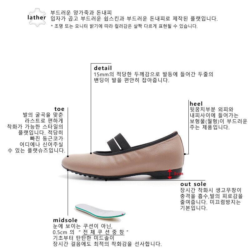 COMMENT 입자가 곱고 부드러운 쉽스킨과 부드러운 돈내피로 제작된 플랫입니다. 의 굴곡을 맞춘 라스트로 편하게 착화가 가능한 스타일의 플랫입니다. 적당히 빠진 둥근코가 언제꺼내 신어도 어디에나 신어주실 수 있는 플랫슈즈입니다. 15mm의 적당한 두께감으로 발등에 들어간 두줄의 밴딩이 발을 편안히 잡아줍니다. 뒷꿈치부분 외피와 내피사이에 들어가는 보형물(월형)이 부드러운 스폰지 월형으로 들어가 전체적으로 말랑말랑한 느낌을 주는 제품입니다. 눈에 보이는 쿠션이 아닌, 기초부터 탄탄한 전체쿠션을 써주어 장시간 걸음에도 최적의 착화감을 선사합니다. 바닥이 전체 생고무창으로 제작된 디자인으로, 고무창이 충격을 흡수해 주어 장시간 착화시에도 발에 피로감을 줄여줍니다. 2cm의 생고무창의 아웃솔과, 1cmㅣ의 쿠션감 있는 키높이로 낮지 않은 플랫슈즈입니다. 너무 낮은 플랫은 아치에도 무리가 가기 때문에 적당한 높이의 3cm플랫슈즈~ 추천해드릴게요!