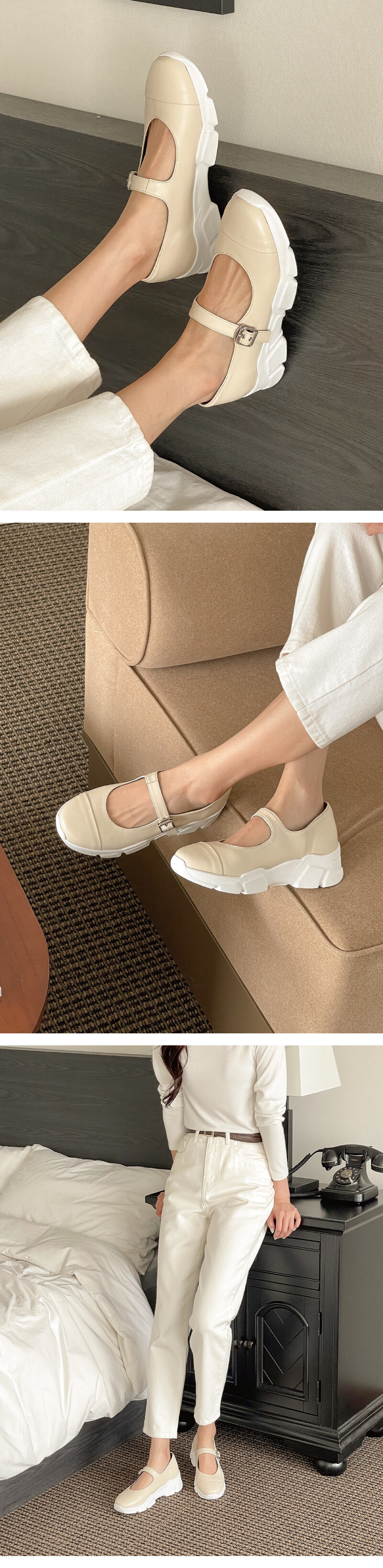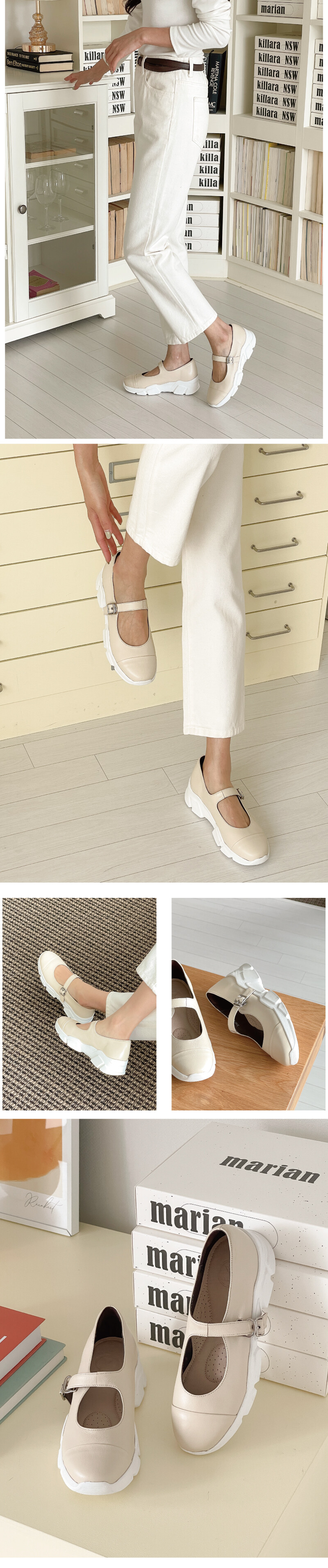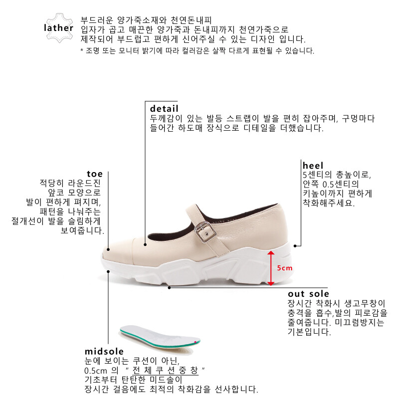 COMMENT 입자가 곱고 부드러운 천연 양가죽에 천연 돈내피 안감을 더해, 발에 닿는 순간부터 포근하고 편안한 착화감을 선사합니다. 적당히 라운드진 앞코 라인은 발가락이 자연스럽게 펴지는 여유로운 구조를 자랑해 장시간 착용에도 부담이 없습니다. 클래식한 플랫슈즈의 실루엣에 스니커즈 아웃솔을 더해 독창적이고 세련된 분위기를 완성했으며, 두께감 있는 발등 스트랩이 발을 안정적으로 잡아주고, 구멍마다 세심하게 더해진 하도매 장식이 섬세한 디테일의 차이를 만들어줍니다. 충격 흡수가 뛰어난 생고무창은 편안함을 오래도록 유지해주며, 미끄럼 방지 기능으로 안정적인 보행을 도와줍니다. 5cm 겉굽에 약 0.5cm의 내부 키높이가 더해져, 편안함과 함께 은은하고 자연스러운 키 높이 효과까지 느낄 수 있는 완성도 높은 슈즈입니다.