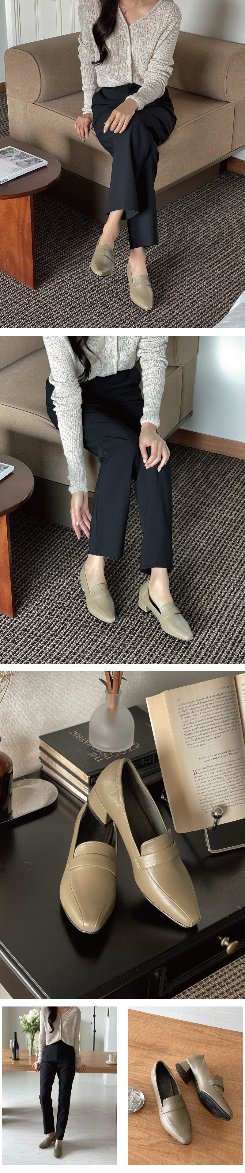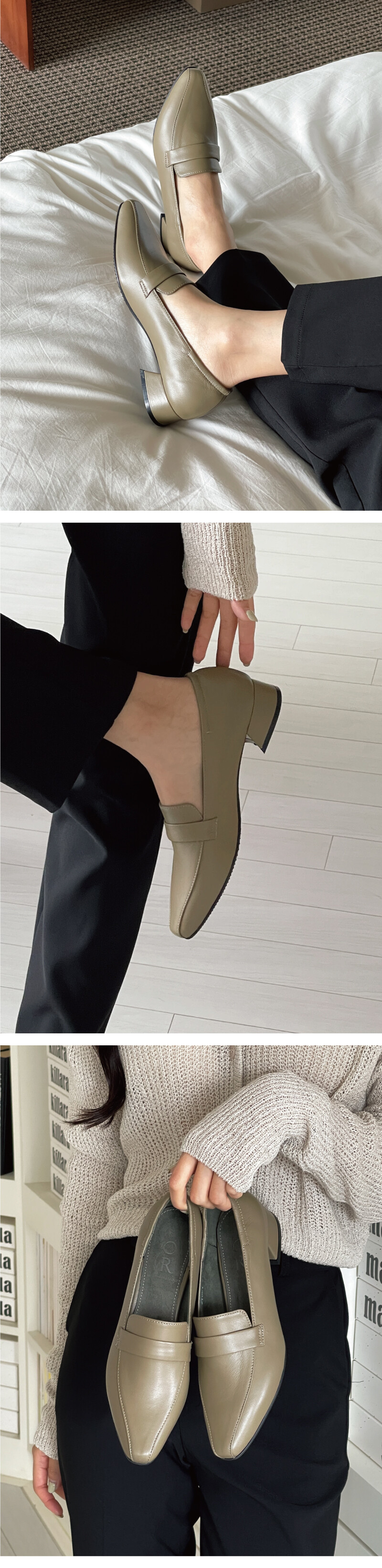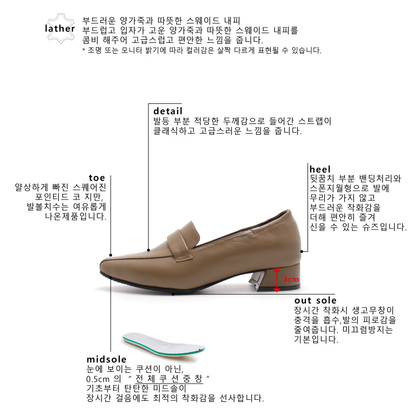 Fw시즌 가을 컬러로 돌아온 클래식한 로퍼를 소개해드려요!부드럽고 입자가 고운 양가죽과 따뜻한 스웨이드 내피를 콤비 해주어 고급스럽고 편안한 느낌을 줍니다. 얄상하게 빠진 스퀘어진 포인티드 코 지만, 발볼치수는 여유롭게 나온제품입니다. 발등 부분 적당한 두께감으로 들어간 스트랩이 클래식하고 고급스러운 느낌을 줍니다. 뒷꿈치 부분 밴딩처리와 스폰지월형으로 발에 무리가 가지 않고 부드러운 착화감을 더해 편안히 즐겨 신을 수 있는 슈즈입니다. 3cm사선굽으로으로 안정되게, 여성스럽고 시크하게 신어주세요! 연질처리된 일반창으로 쉽게 닳지 않으며 미끄럼방지에 뛰어납니다.