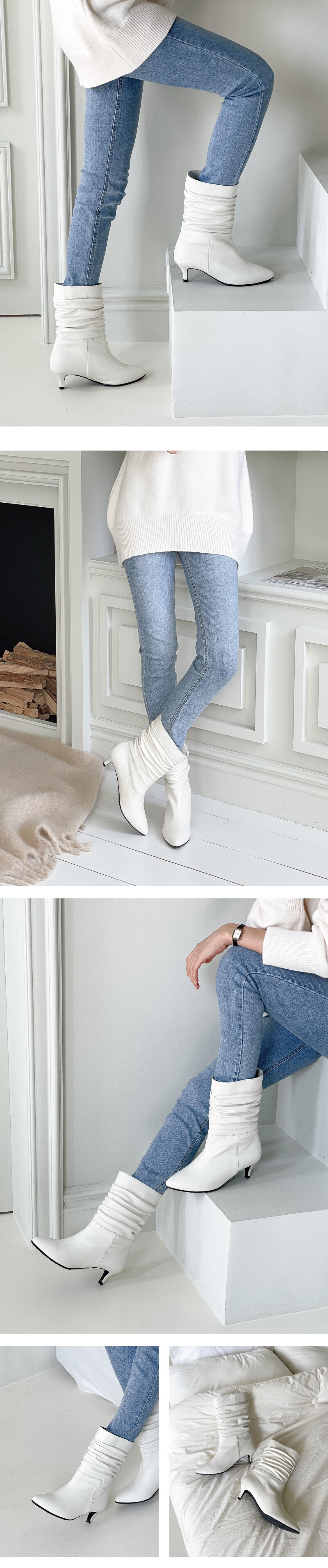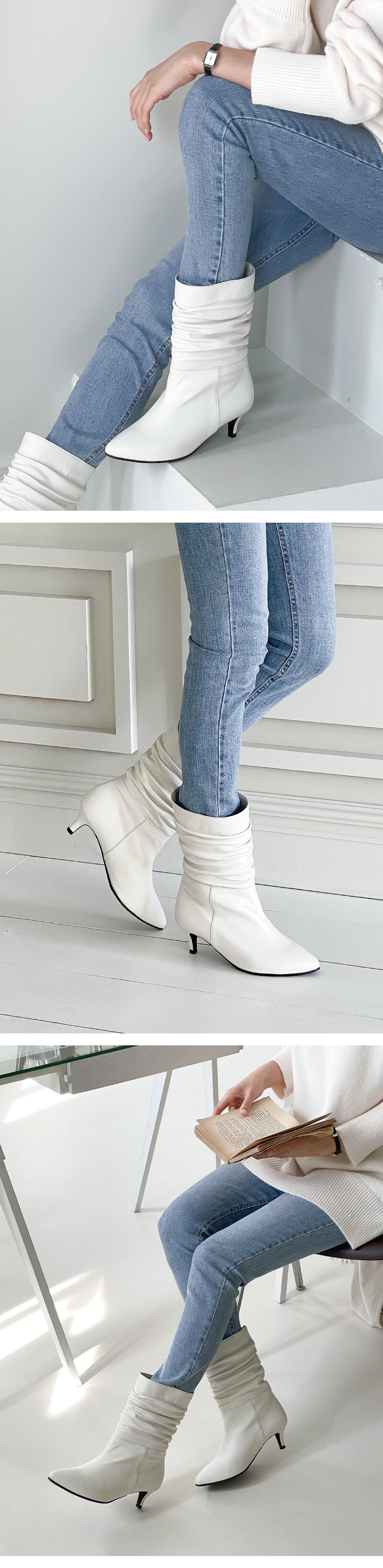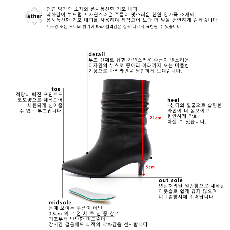 착화감이 부드럽고 자연스러운 주름이 멋스러운 천연 양가죽 소재와 퐁시퐁신한 기모 내피를 사용하여 제작되어 보다 더 발을 편안하게 주는 부츠로, 적당히 빠진 포인트드 코모양으로 제작되어 세련되게 신어줄 수 있습니다. 부츠 전체로 잡힌 자연스러운 주름이 멋스러운 디자인의 부츠로 종아리 아래까지 오는 미들한 기장으로 다리라인을 날씬하게 보여줍니다. 5센티의 힐굽으로 슬림한 라인이 더 돋보이고 편안하게 착화 하실 수 있습니다.