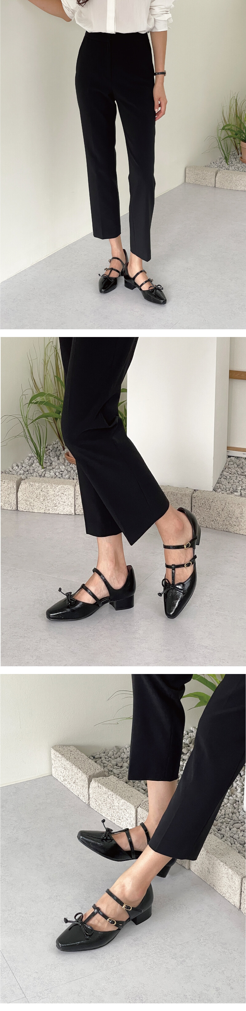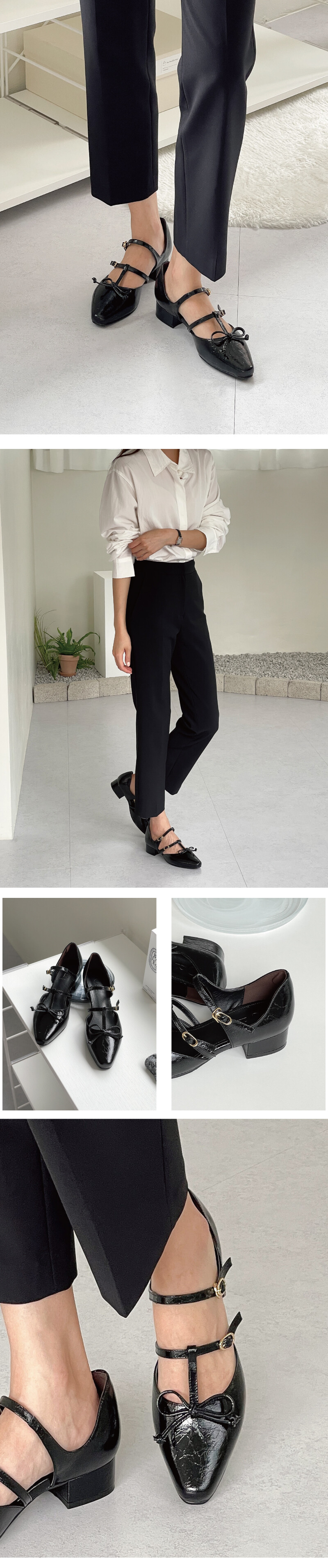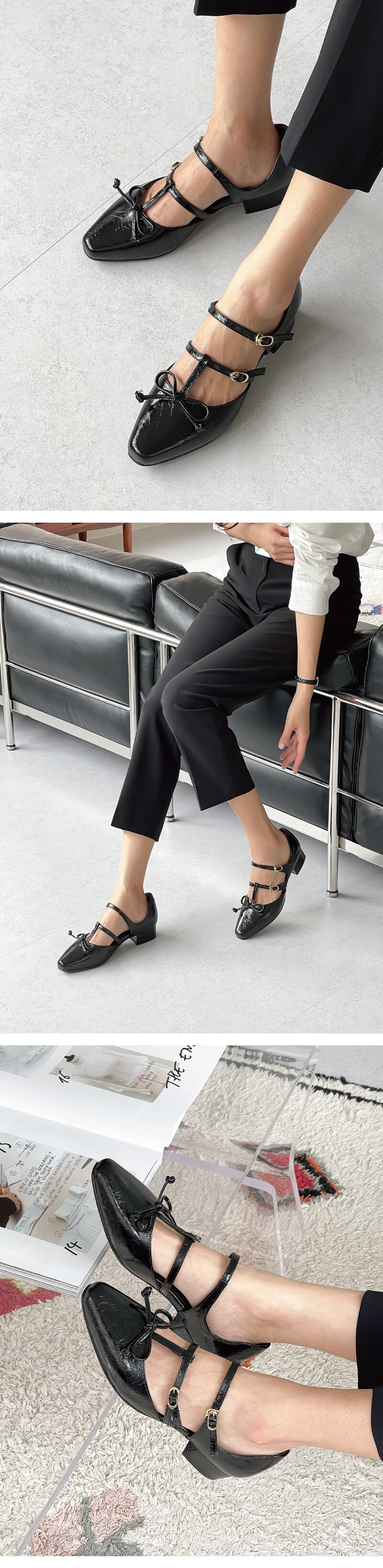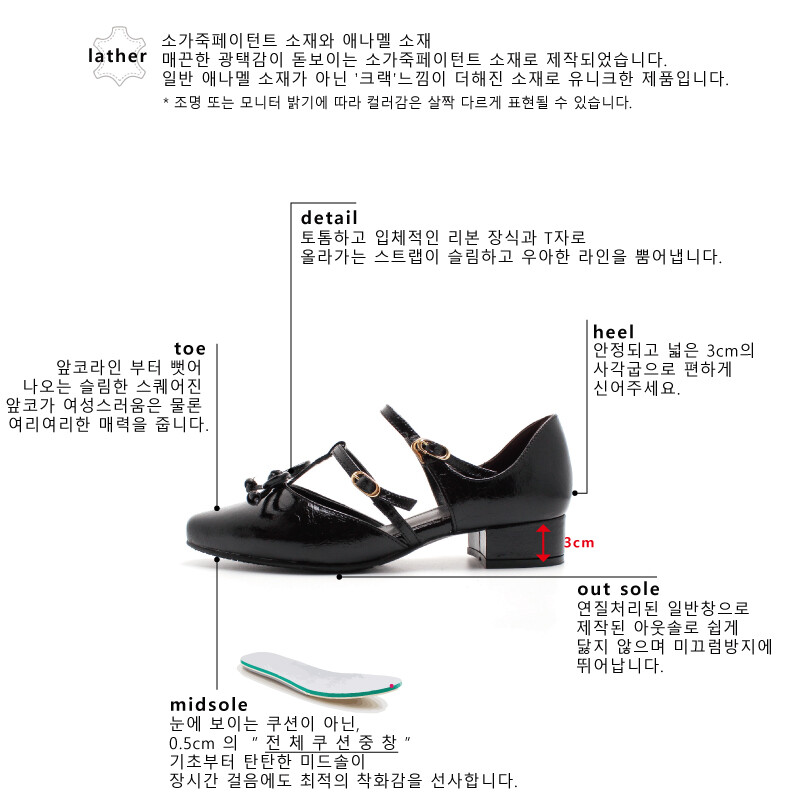 앞코라인 부터 뻣어 나오는 슬림한 스퀘어진 앞코가 여성스러움은 물론 여리여리한 매력을 줍니다. 매끈한 광택감이 돋보이는 소가죽페이턴트 소재로 제작되었습니다. 일반 애나멜 소재가 아닌 '크랙'느낌이 더해진 소재로 유니크한 제품입니다. 토톰하고 입체적인 리본 장식과 T자로 올라가는 스트랩이 슬림하고 우아한 라인을 뿜어냅니다. 사이드 라인에 골드장식의 고리형태로 신고 벗기 편한 라인으로 제작된 플랫슈즈입니다. 안정되고 넓은 3cm의 사각굽으로 편하게 신어주세요. 연질처리된 일반창으로 제작된 아웃솔로 쉽게 닳지 않으며 미끄럼방지에 뛰어납니다.