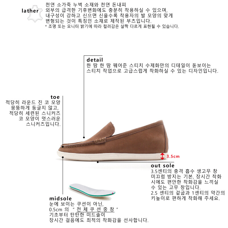 COMMENT 수제화만의 디테일이 돋보이는 스티치 작업으로 고급스럽게 착화하실 수 있는 로퍼스니커즈를 소개해드려요! 외부의 급격한 기후변화에도 충분히 착용하실 수 있으며, 내구성이 강하고 신으면 신을수록 착용자의 발 모양의 맞게 변형되는 것이 특징인 소재로 제작된 로퍼입니다. 뭉뚱하게 둥글지 않고, 적당히 세련된 스니커즈 코 모양이 멋스러운 스니커즈입니다. 장시간 착화 시에도 편안한 착화감을 느끼실 수 있는 고무 창입니다. 2.5 센티의 겉굽과 1센티의 약간의 키높이로 편하게 착화해 주세요.