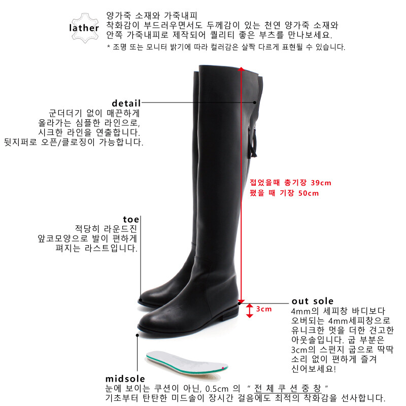 COMMENT 군더더기 없이 매끈하게 올라가는 심플한 라인으로, 시크한 라인을 연출합니다. 뒷지퍼로 오픈/클로징이 가능하며, 두가지 스타일링이 가능한 롱부츠를 소개해드려요-! 었을때 총기장 39cm / 폈을 때 기장 50cm으로 제작된 상품입니다. 착화감이 부드러우면서도 두께감이 있는 천연 양가죽 소재와 안쪽 내피도 가죽내피로 제작되어 퀄리티 좋은 부츠를 만나보세요. 사람마다 다른 다리 기장으로 다리 사이즈 체크 후 제작해 드리고 있습니다. (*부츠 통이나 기장은 기준점이 넘어갈 경우 추가요금이 발생합니다.) 적당히 라운드진 앞코모양으로 발이 편하게 펴지는 라스트입니다. 4mm의 세피창 바디보다 오버되는 4mm세피창으로 유니크한 멋을 더한 견고한 아웃솔입니다. 굽 부분은 3cm의 스펀지 굽으로 딱딱 소리 없이 편하게 즐겨 신어보세요!