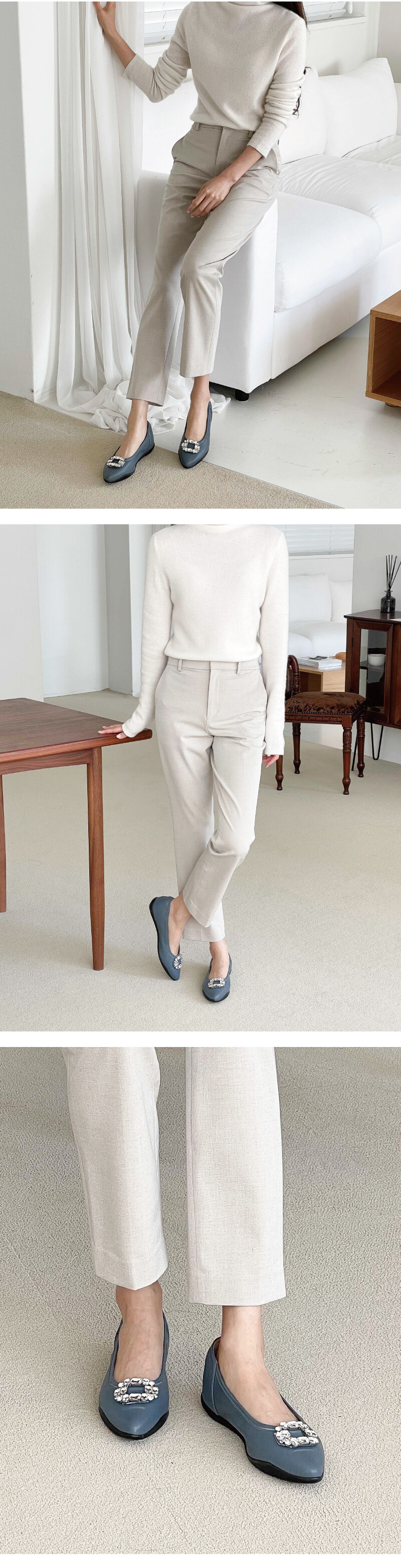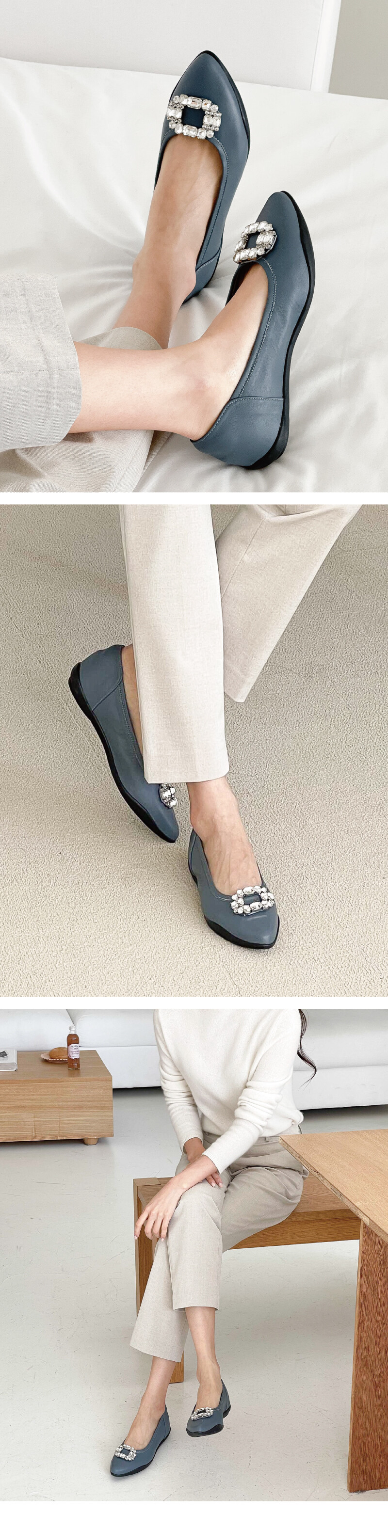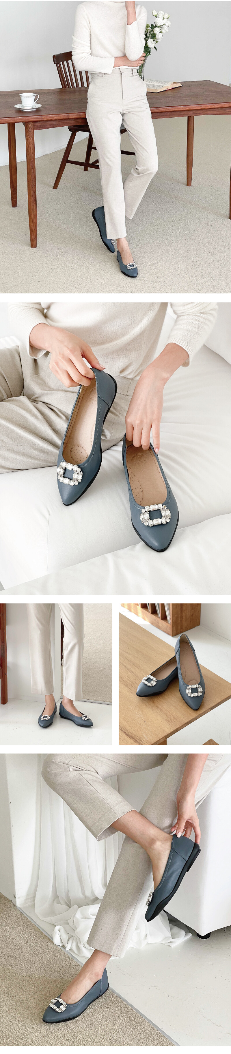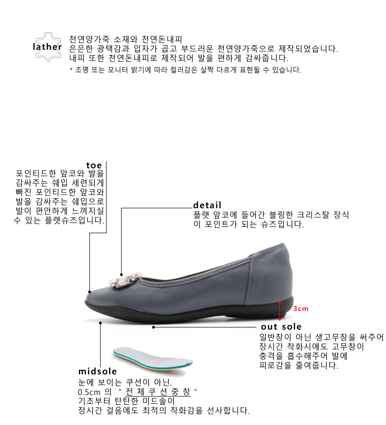 COMMENT 신발 앞코에 들어간 블링한 크리스탈 장식이 포인트가 되는 플랫슈즈입니다. 생고무창의 아웃솔로 편안한착화감을 느끼실 수 있으며 장시간 착화시에도 무리가 없는 제품입니다. 입자가 곱고 부드러운 양가죽 소재로 제작되어 편안한 착화감을 느끼실 수 있으며 편안히 데일리슈즈로 포인트되게 신어주세요!