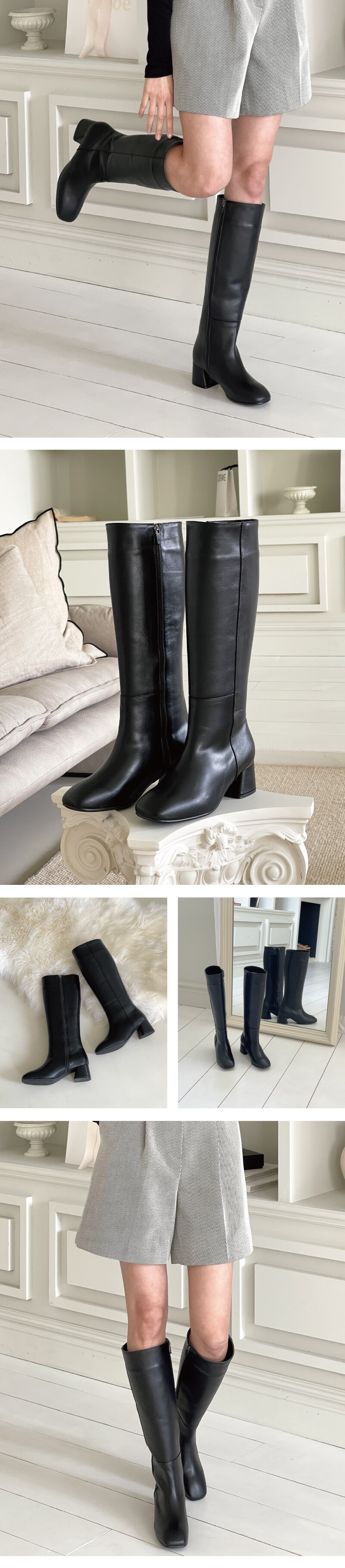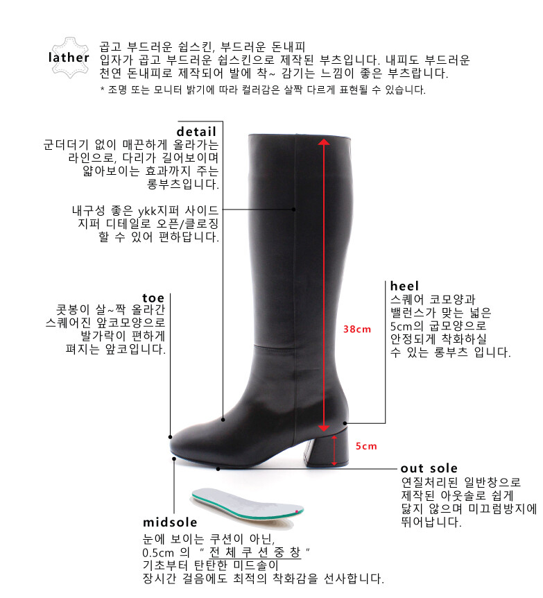 COMMENT 소재가 매끈하고 힘이 있는 소가죽으로 오랜 시간 신어도 튼튼하게 신어주실 수 있는 가죽입니다. 안쪽 내피는 퐁신퐁신하고 쿠션감이 있는 기모내피로 제작되어 부드러운 착화감을 느끼실 수 있는 롱부츠입니다. 더더기 없이 매끈하게 올라가는 라인으로, 다리가 길어보이며 얇아보이는 효과까지 주는 부츠 총기장(굽 제외) 38cm 기본 롱부츠 기장감입니다. (*235사이즈 기준이므로 약간의 오차는 있을 수 있으니 참고해 주세요.) 콧봉이 살~짝 올라간 스퀘어진 앞코모양으로 발가락이 편하게 펴지는 앞코로 데일리슈즈가 되는 제품입니다. 내구성 좋은 ykk지퍼 사이드 지퍼 디테일로 오픈/클로징 할 수 있어 편하답니다.