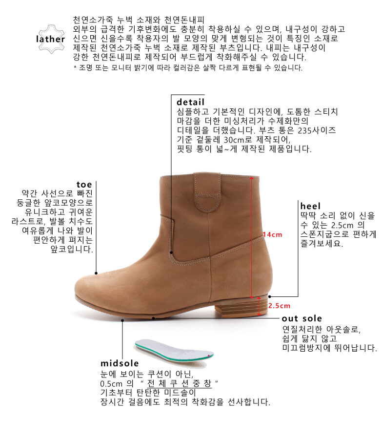 COMMENT 약간 사선으로 빠진 둥글한 앞코모양으로 유니크하고 귀여운 라스트로, 발볼 치수도 여유롭게 나와 발이 편안하게 펴지는 앞코로 제작된 부츠를 소개해드려요.심플하고 기본적인 디자인에, 도톰한 스티치 마감을 더한 미싱처리가 수제화만의 디테일을 더했습니다. 부츠 통은 235사이즈 기준 겉둘레 30cm로 제작되어, 핏팅 통이 넓~게 제작된 제품입니다. 외부의 급격한 기후변화에도 충분히 착용하실 수 있으며, 내구성이 강하고 신으면 신을수록 착용자의 발 모양의 맞게 변형되는 것이 특징인 소재로 제작된 천연소가죽 누벅 소재로 제작된 부츠입니다. 내피는 내구성이 강한 천연돈내피로 제작되어 부드럽게 착화해주실 수 있습니다. 부츠 총기장(굽 제외) 기본이 되는 길이, 14cm 앵클부츠입니다.(*235사이즈 기준이므로 약간의 오차는 있을 수 있으니 참고해 주세요.)