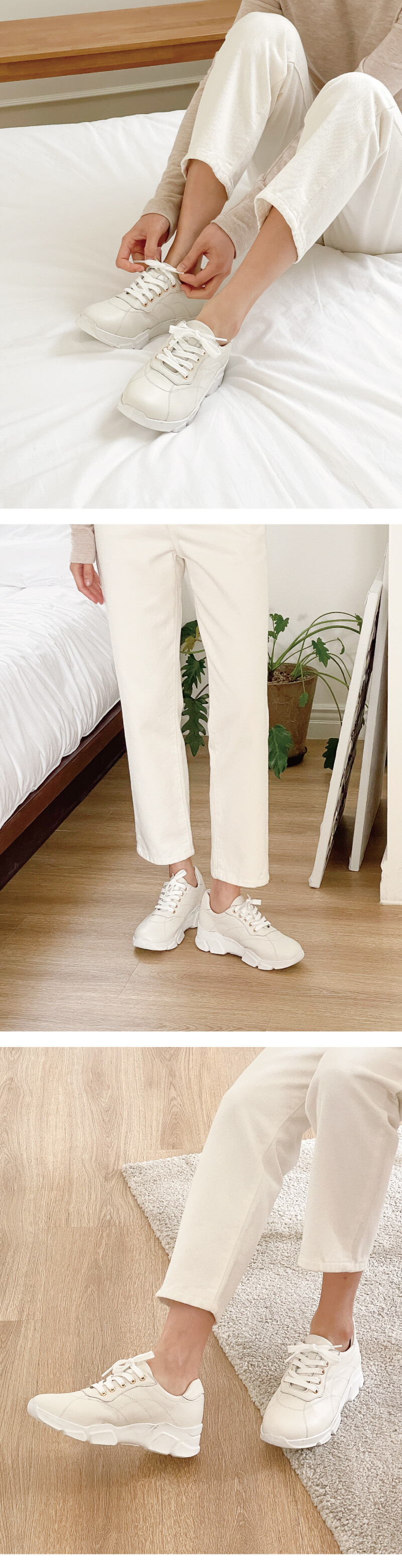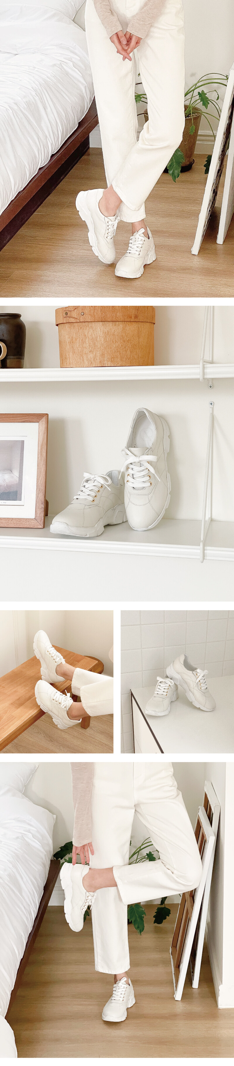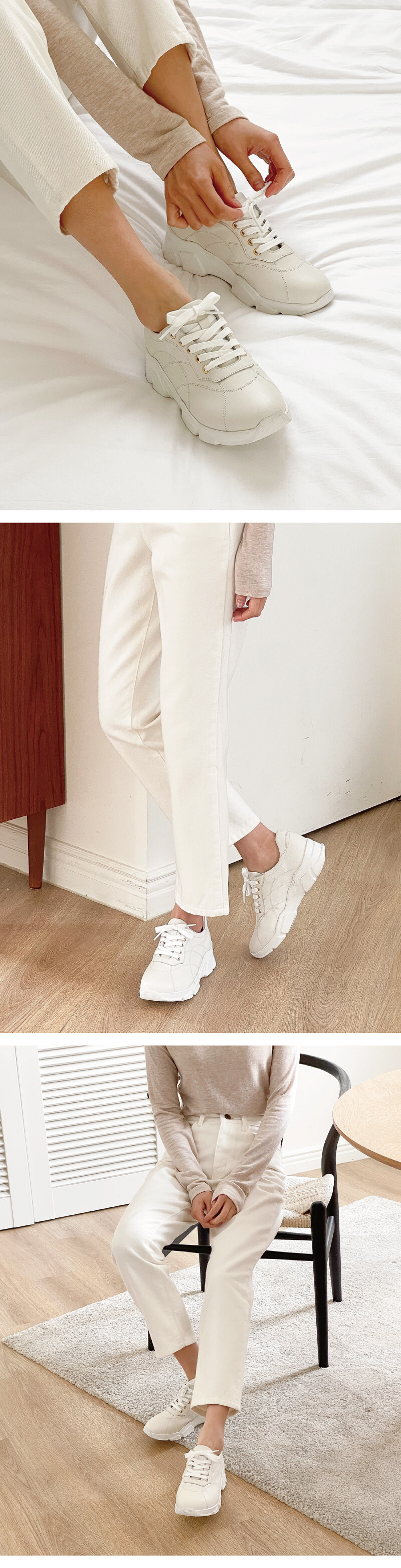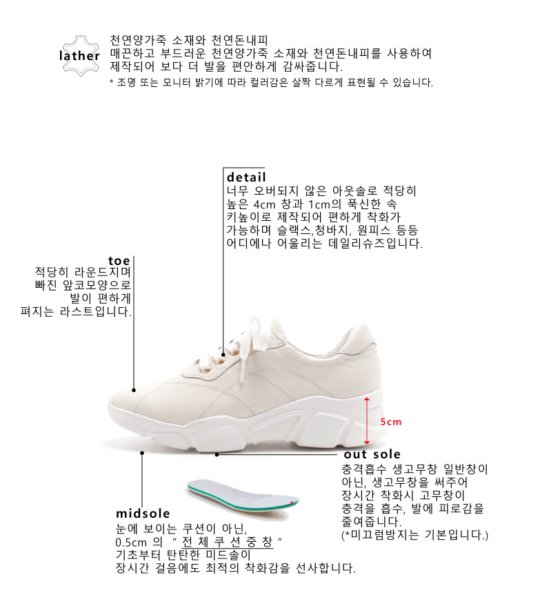 COMMENT 차원이 다른 디테일로 제작되는, 국내생산 스니커즈 작은조각 하나하나 선생님들의 정성스러운 작업으로 생산되는 국내 스니커즈입니다. 깔끔한 디테일로 시크하게 착화 할 수 있는 패턴으로, 어디에나 데일리슈즈로 즐겨 신으실 수 있는 디자인입니다. 매끈하고 부드러운 천연양가죽 소재와 천연돈내피를 사용하여 제작되어 보다 더 발을 편안하게 감싸줍니다. 적당히 라운드지며 빠진 앞코모양으로 발이 편하게 펴지는 라스트입니다. 너무 오버되지 않은 아웃솔로 적당히 높은 4cm 창과 1cm의 푹신한 속 키높이로 제작되어 편하게 착화가 가능하며 슬랙스,청바지, 원피스 등등 어디에나 어울리는 데일리슈즈입니다. 충격흡수 생고무창 일반창이 아닌, 생고무창을 써주어 장시간 착화시 고무창이 충격을 흡수, 발에 피로감을 줄여줍니다. (*미끄럼방지는 기본입니다.)