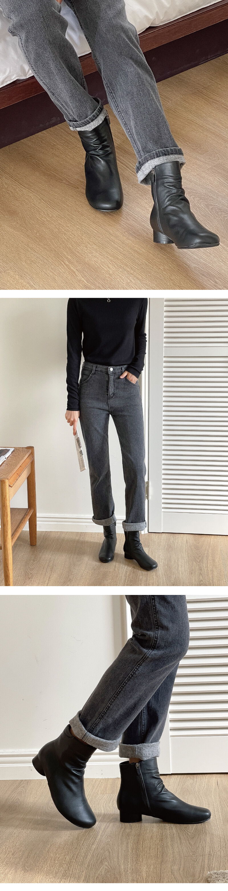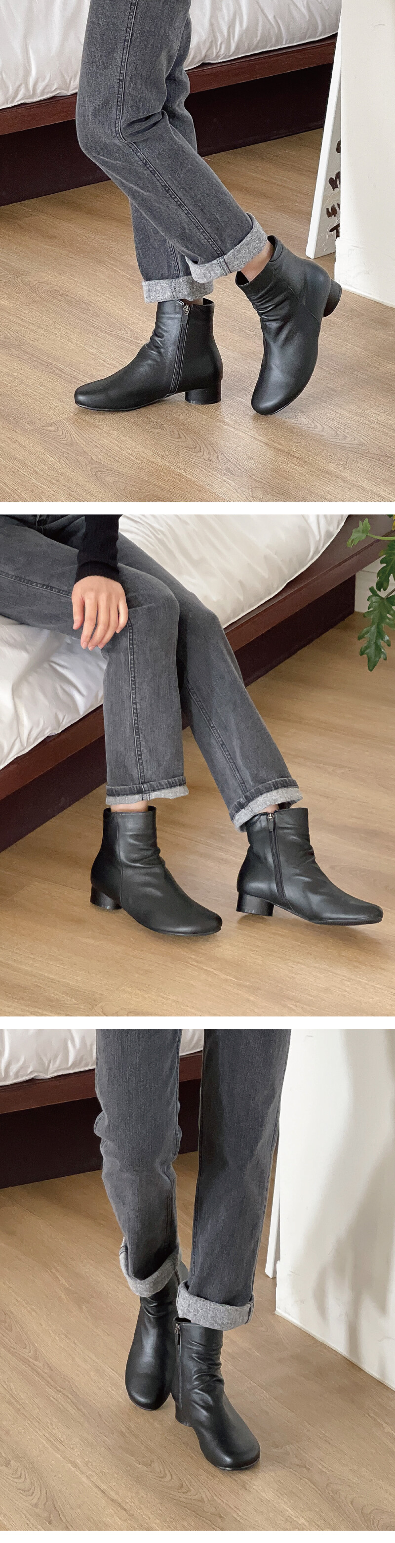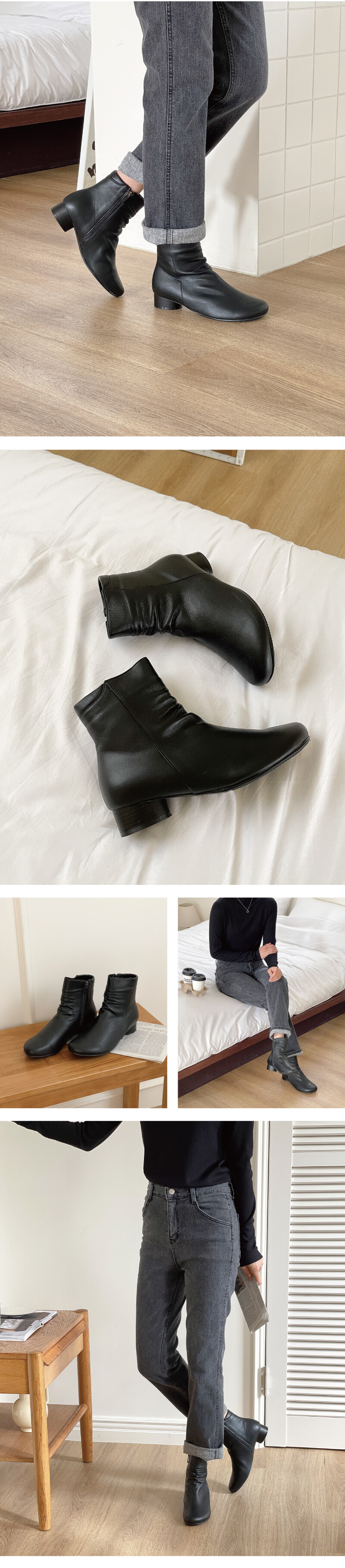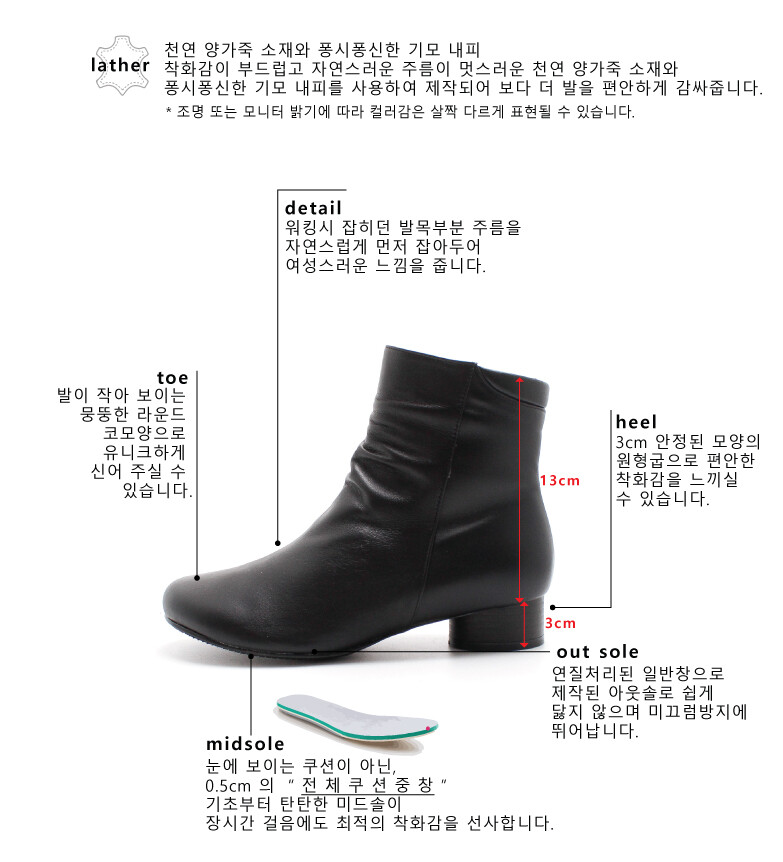 자연스러운 주름이 매력적인 앵클기장의 부츠를 소개해드려요! 워킹시 많이 잡히던 "발목주름"을 먼저 디테일로 잡아주어 여성스럽고 자연스러운 느낌을 주었습니다. 착화감이 부드럽고 자연스러운 주름이 멋스러운 천연 양가죽 소재와 퐁시퐁신한 기모 내피를 사용하여 제작되어 보다 더 발을 편안하게 감싸줍니다.
