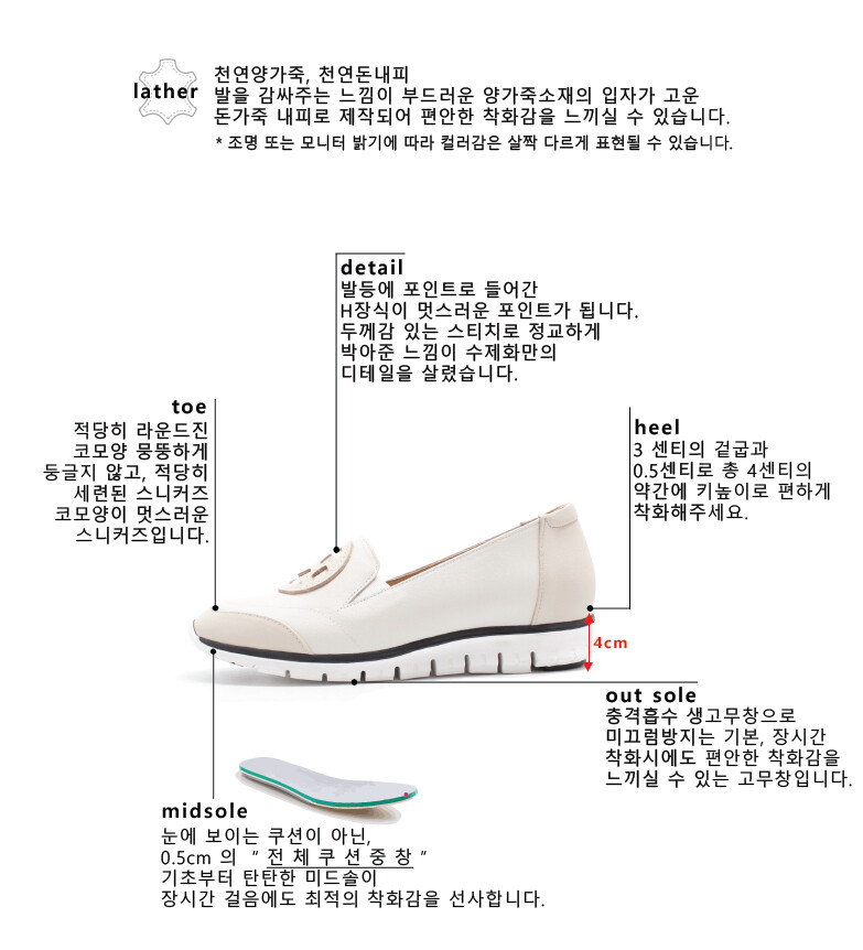 COMMENT 컬러별로 색다른 느낌을 주는 H장식 슬립 스니커즈입니다. 아이보리컬러는 은은한콤비 배색과 베이지컬러는 브라운과 콤비해 멋스러운느낌을 한껏살렸습니다. 디테일이 살아있는 H장식은 두께감 있는 스티치로 정교하게 박아준 느낌이 수제화만의 디테일을 살렸습니다. 보통 슬립온 스타일보단 발을 짧게 감싸주어 다리가 길어보이는 효과까지 주는 스니커즈입니다.