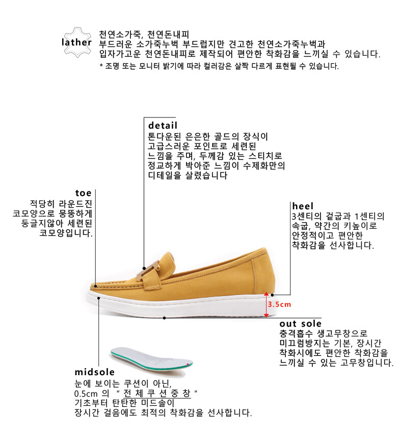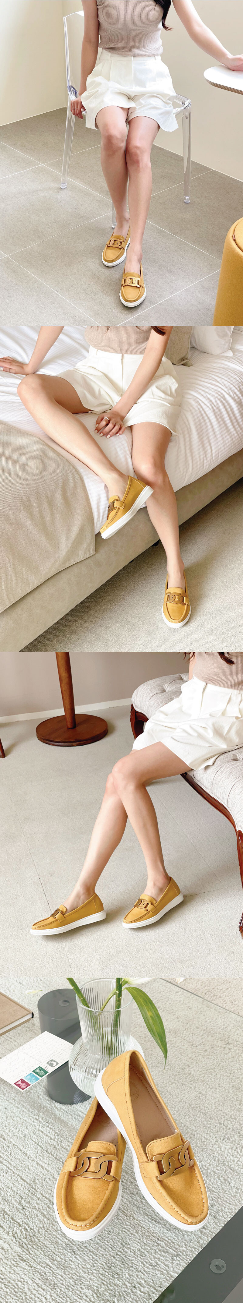 COMMENT 볼드한 체인장식이 포인트로 들어간 로퍼스니커즈입니다. 부드러운 소가죽누벅소재로 화사하게 착화해보세요! 3.5센티의 굽높이로 편하게 즐겨 신으실 수 있으며, 슬림한 고무창의 아웃솔로 여성스러움이 묻어나는 스니커즈랍니다. 적당히 라운드진 앞코모양이 매력적인 아이템이 되실 수 있어요. 사이즈는 정사이즈로 추천해드리며, 두사이즈를 착화하시는 분들껜 작은사이즈로 권해드립니다.