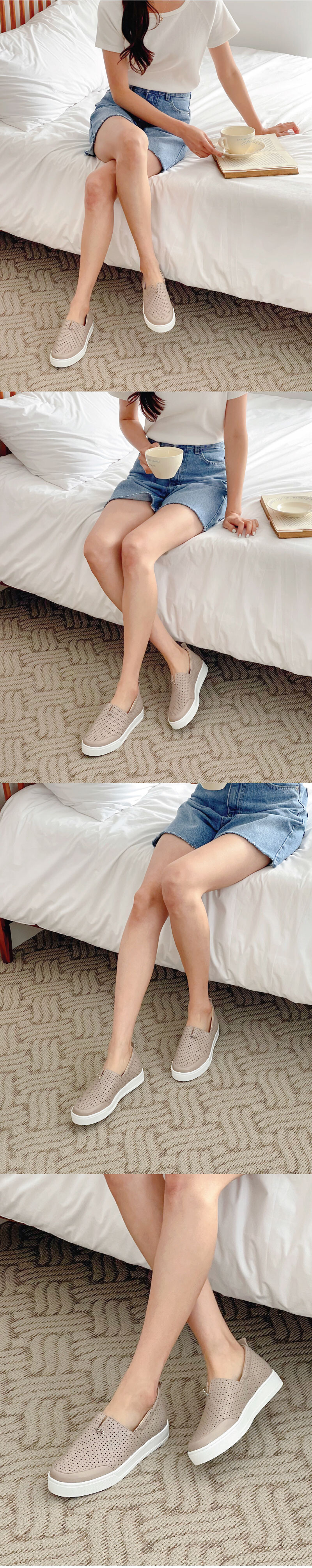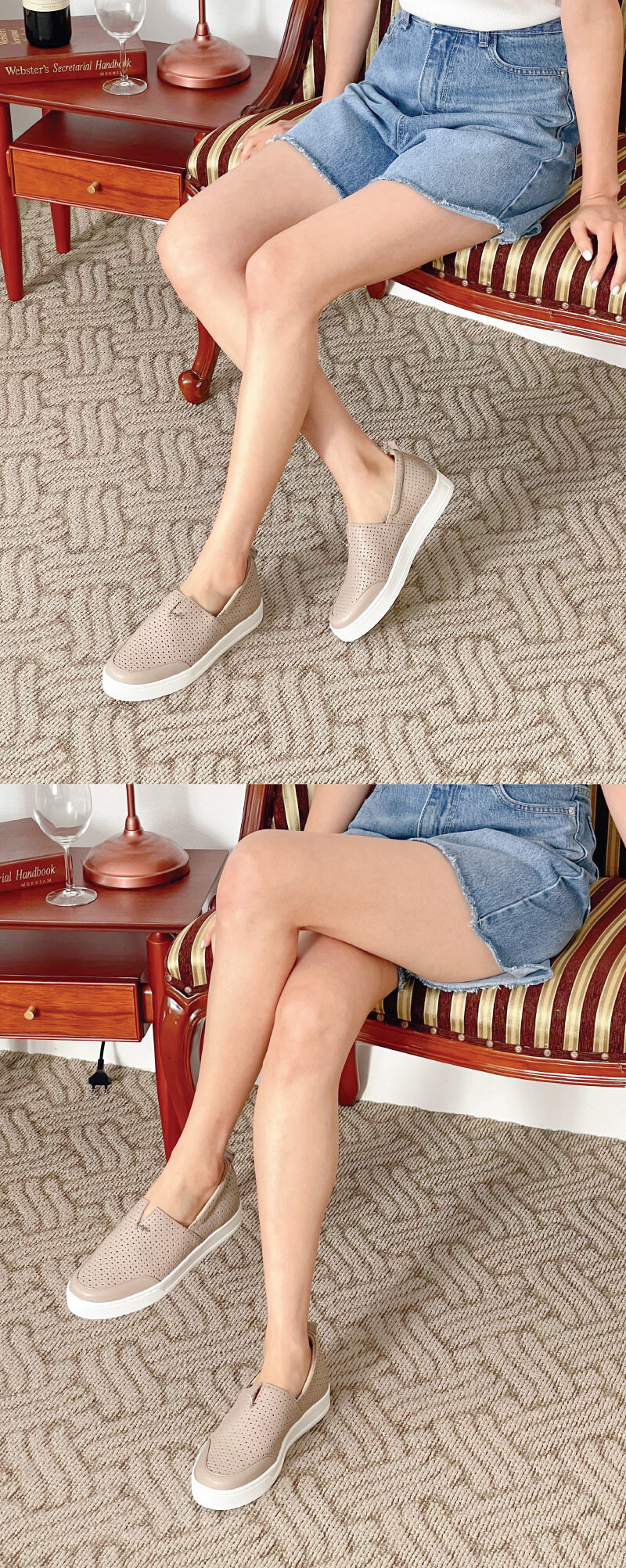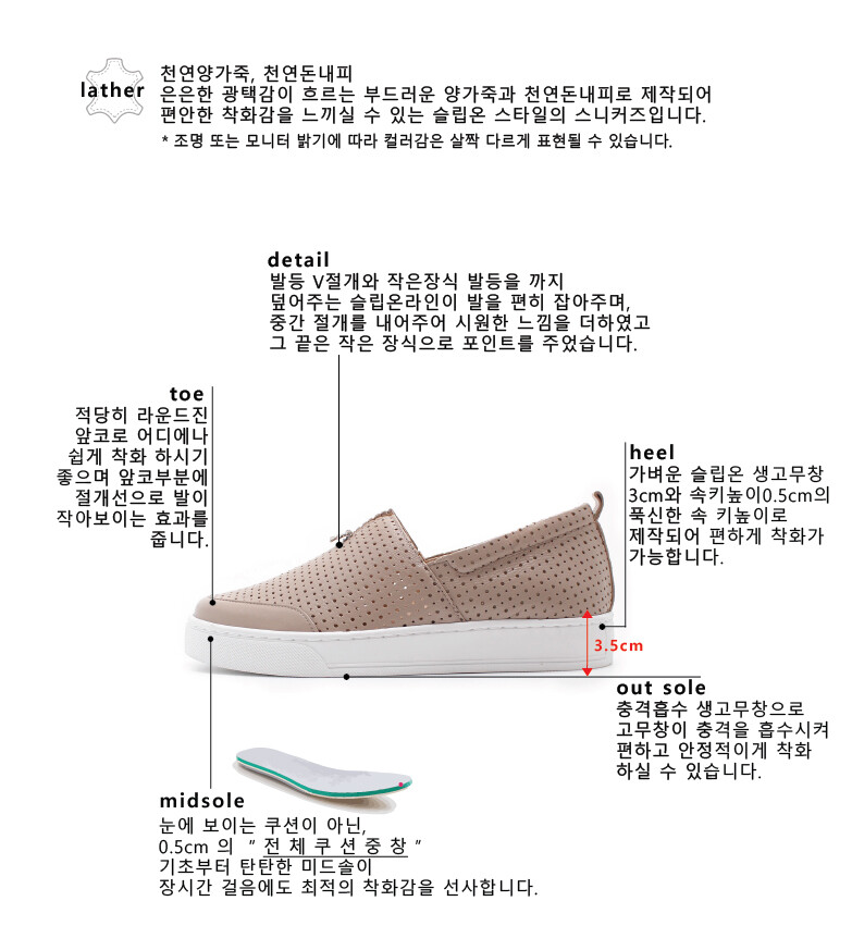 COMMENT 부드러운 양가죽과 돈내피로 제작되어 부드러운 착화감을 주는 슬립온 스니커즈를 소개합니다! 바디전체에 작은 펀칭을 뚤어주어 시원하게, 보다 부드럽게 신으실 수 있으며 다소 답답해보일수도 있는 발등라인에 절개와 작은 장식으로 포인트를 주었습니다. 가벼운 고무창의 3.5cm높이로 편하게 즐겨신어주세요!