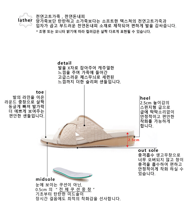 COMMENT 스트랩이 X자 크로스로 들어간 고급스러운 슬리퍼 샌들을 소개해드립니다. 부드럽고 힘이 있는 천연 고트가죽의 소재와 돈내피로 제작되어 편안한착화감을 느끼실 수 있으시며, 체스무늬의 포인트가 고급스러운 느낌을 주는 슬리퍼 샌들입니다. 어디에든 시원하게 착화하실 슬리퍼라 가볍게 즐겨신으실 수 있는 제품입니다. 2.5cm의 가벼운 아웃솔로 오래신어도 불편함 없이 즐겨신어주세요!
