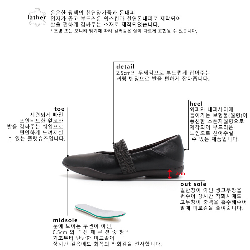 COMMENT 입자가 곱고 부드러운 쉽스킨과 천연돈내피로 제작되어 발을 편하게 감싸주는 소재로 제작되었습니다. 2.5cm의 두께감으로 부드럽게 잡아주는 셔링 밴딩으로 발을 편하게 잡아줍니다. 세련되게 빠진 포인티드한 앞코와 발을 감싸주는 쉐입으로 발이 편안하게 느껴지실 수 있는 플랫슈즈입니다. 외피와 내피사이에 들어가는 보형물(월형)이 퐁신한 스폰지월형으로 제작되어 부드러운 느낌으로 신어주실 수 있는 제품입니다. 일반창이 아닌 생고무창을 써주어 장시간 착화시에도 고무창이 충격을 흡수해주어 발에 피로감을 줄여줍니다.
