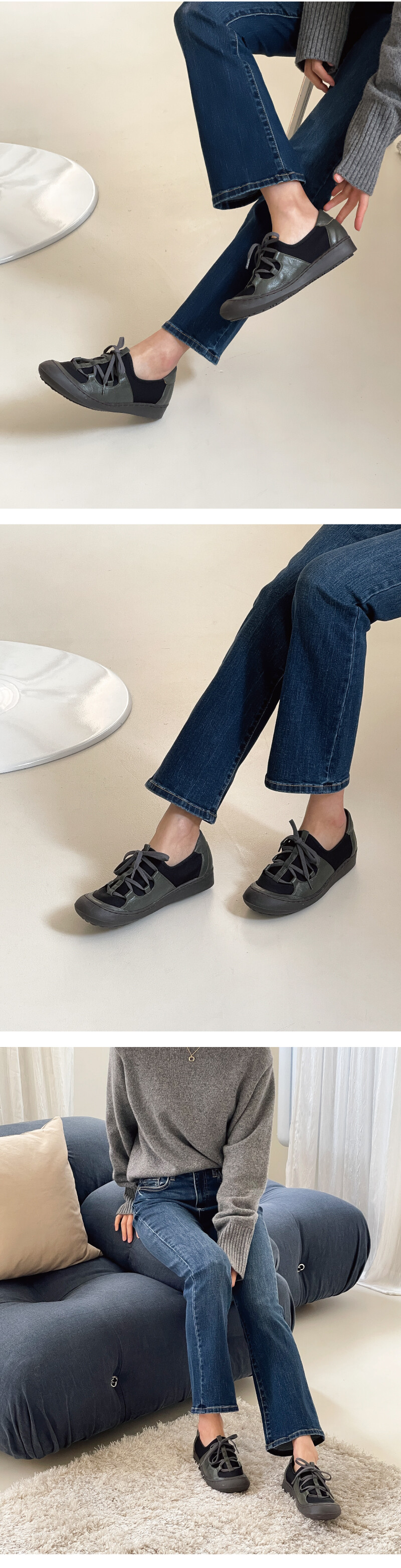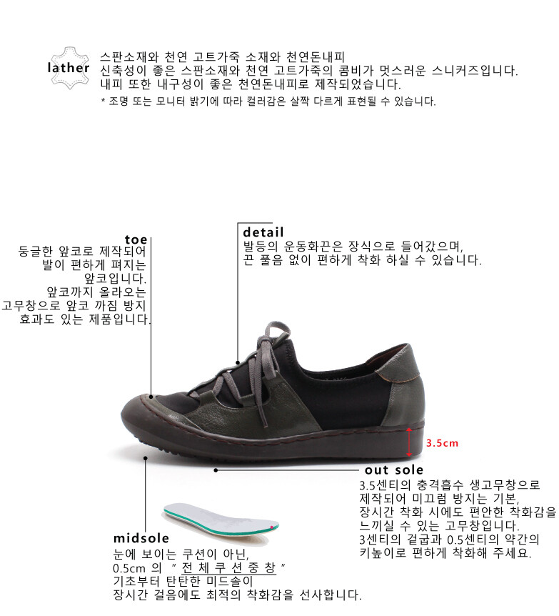 COMMENT 발등의 운동화끈은 장식으로 들어간 슈즈! 끈 풀음 없이 편하게 착화해주실 수 있는 스니커즈입니다. 신축성 좋은 스판가죽과 천연고트가죽의 콤비로 멋스럽게 착화하실 수 있는 제품입니다. 둥글한 앞코로 제작되어 발이 편하게 펴지는 앞코입니다. 앞코까지 올라오는 고무창으로 앞코 까짐 방지 효과도 있는 제품입니다. 3.5센티의 충격흡수 생고무창으로 제작되어 미끄럼 방지는 기본, 장시간 착화 시에도 편안한 착화감을 느끼실 수 있는 고무창입니다. 3센티의 겉굽과 0.5센티의 약간의 키높이로 편하게 착화해 주세요.