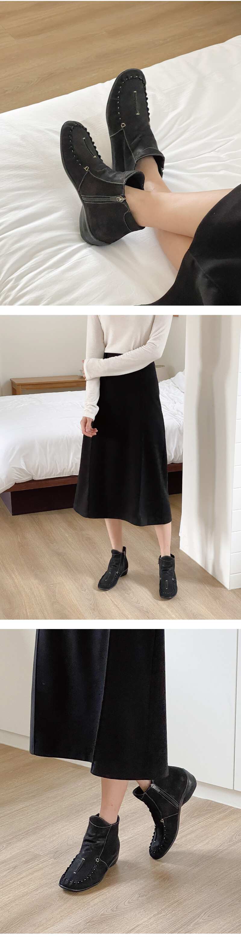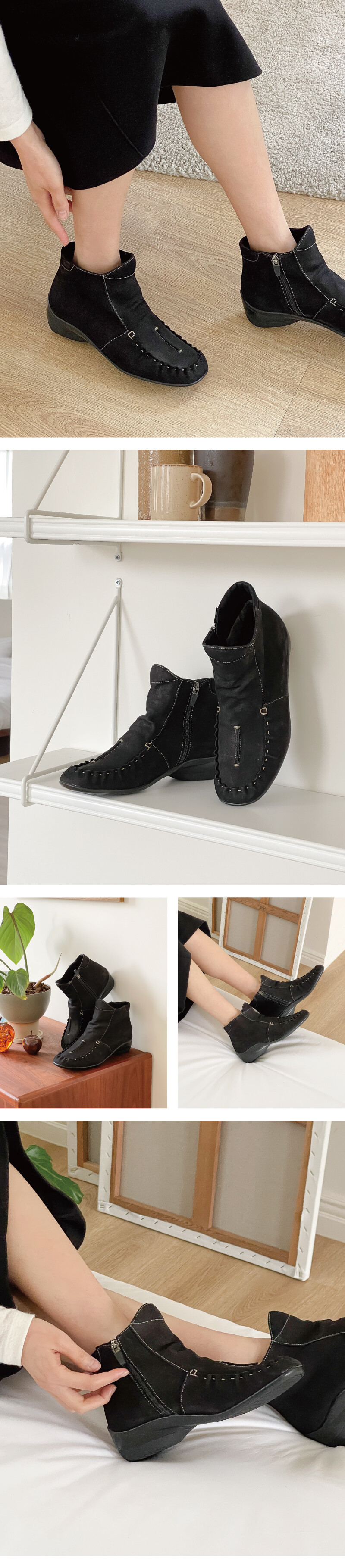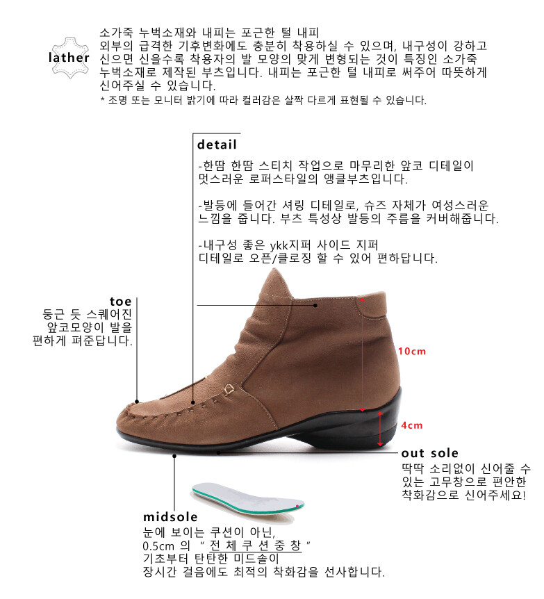 COMMENT 한땀 한땀 스티치 작업으로 마무리한 앞코 디테일이 멋스러운 로퍼스타일의 앵클부츠입니다. 외부의 급격한 기후변화에도 충분히 착용하실 수 있으며, 내구성이 강하고 신으면 신을수록 착용자의 발 모양의 맞게 변형되는 것이 특징인 소가죽 누벅소재로 제작된 부츠입니다. 내피는 포근한 털 내피로 써주어 따뜻하게 신어주실 수 있습니다. 부츠 총기장(굽 제외) 10cm의 비교적 짧은 기장감으로 신고 벗기 편한 숏부츠입니다. (*235사이즈 기준이므로 약간의 오차는 있을 수 있으니 참고해 주세요) 둥근 듯 스퀘어진 앞코모양이 발을 편하게 펴준답니다. 발등에 들어간 셔링 디테일로, 슈즈 자체가 여성스러운 느낌을 줍니다. 부츠 특성상 발등의 주름을 커버해줍니다. 내구성 좋은 ykk지퍼 사이드 지퍼 디테일로 오픈/클로징 할 수 있어 편하답니다. 딱딱 소리없이 신어줄 수 있는 고무창으로 편안한 착화감으로 신어주세요!