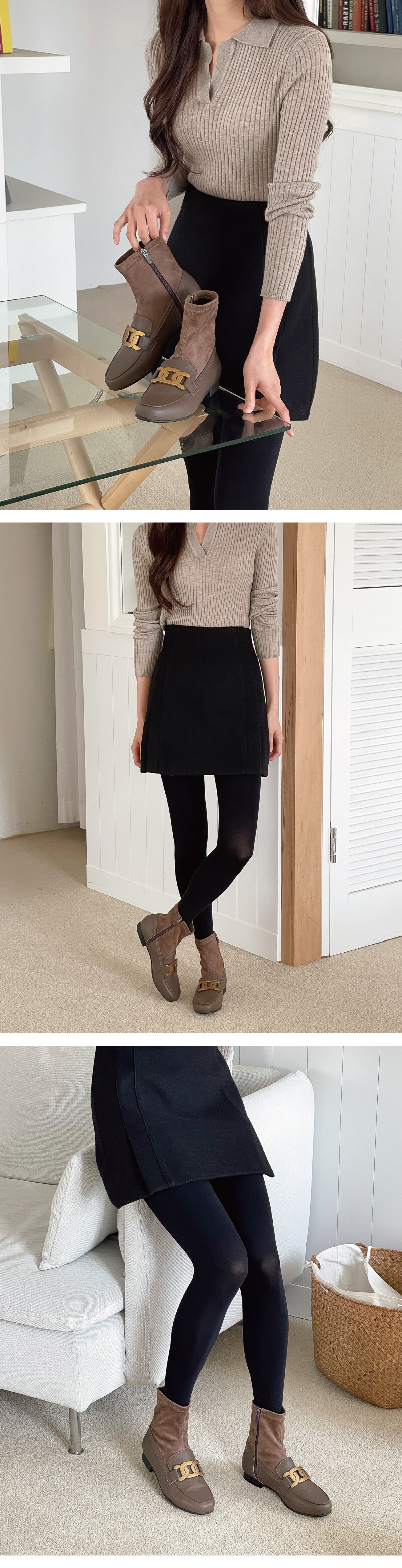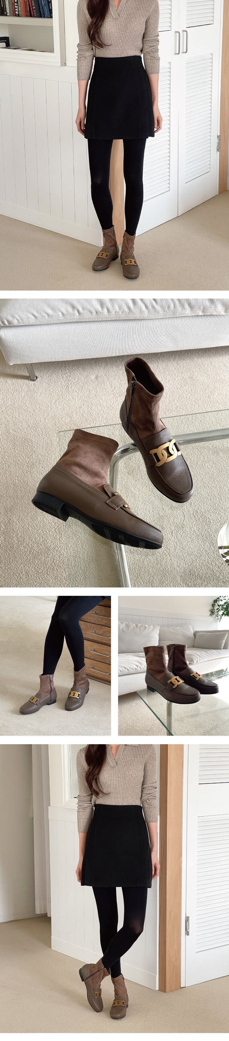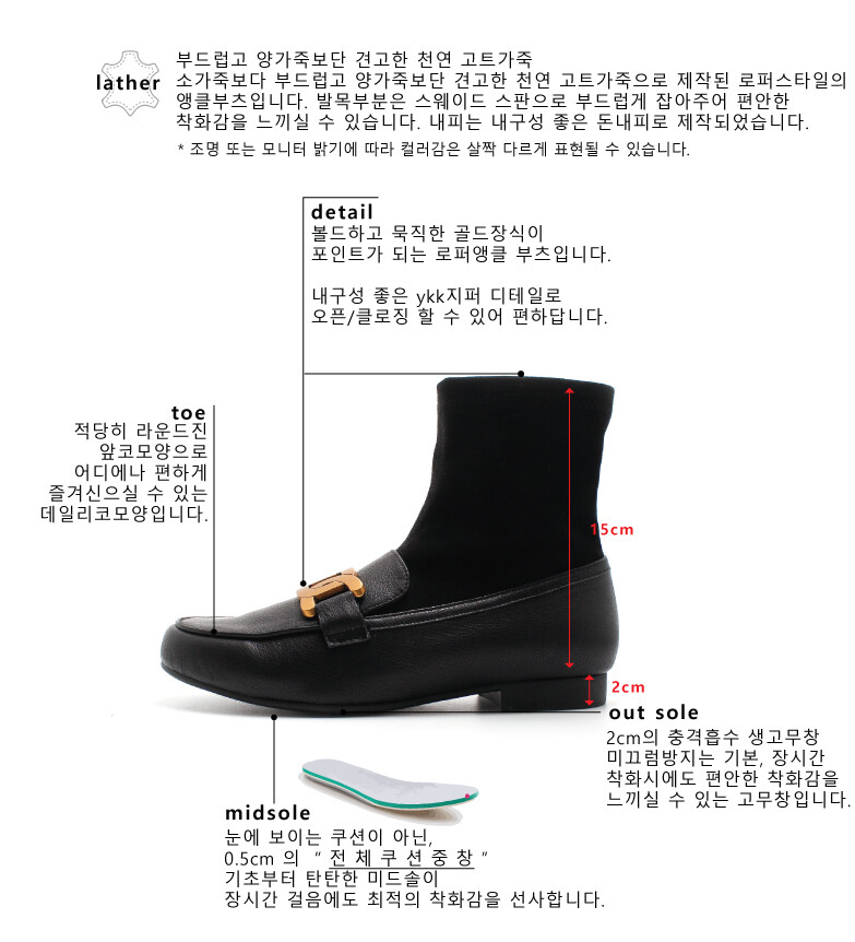 로퍼스타일로 왔다가 앵클부츠로 올라가는 색다른 느낌의 부츠를 만나보실 수 있는 부츠르 소개해드립니다. 볼드한 장식이 포인트로 들어가 밋밋하지 않게 신어주실수 있어요.소가죽보다 부드럽고 양가죽보단 견고한 천연 고트가죽으로 제작된 로퍼스타일의 앵클부츠입니다. 발목부분은 스웨이드 스판으로 부드럽게 잡아주어 편안한 착화감을 느끼실 수 있습니다. 내피는 내구성 좋은 돈내피로 제작되었습니다. 볼드하고 묵직한 골드장식이 포인트가 되는 로퍼앵클부츠로 총기장(굽 제외) 15cm의 적당한 기장감으로 제작된 앵클부츠입니다. (*235사이즈 기준이므로 약간의 오차는 있을 수 있으니 참고해 주세요)
