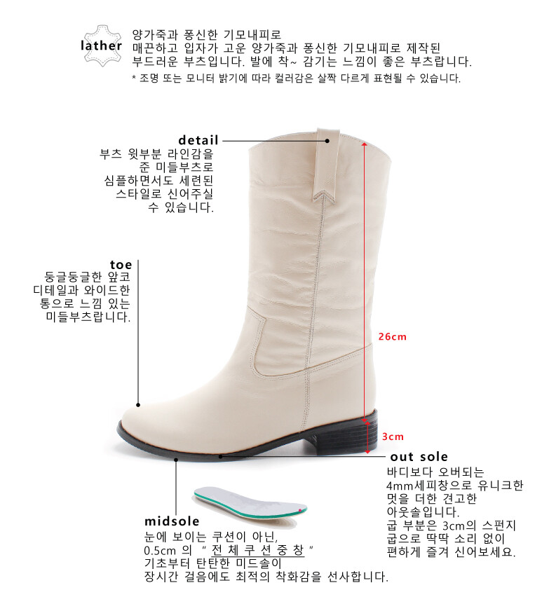 COMMENT 부츠 윗부분 라인감을 준 미들부츠로 심플하면서도 세련된 스타일로 신어주실 수 있는 슈즈로, 매끈하고 입자가 고운 양가죽과 퐁신한 기모내피로 제작된 부드러운 부츠입니다. 발에 착~ 감기는 느낌이 좋은 부츠랍니다. 부츠 총기장(굽 제외) 26cm로 제작된 미들부츠입니다. 둥글둥글한 앞코 디테일과 와이드한 통으로 느낌 있는 미들부츠랍니다. 시간이 지날수록 더욱 편안하게 착용 가능하며, 눈에 보이지 않는 부분까지 까다롭게 제작하는 베티아노의 특별한 디자인 공식으로 가볍고 견고한 아웃솔에 미끄럼 방지를 위한 논슬립가공을 추가하여 편안하며 안정적인 워킹을 돕습니다.