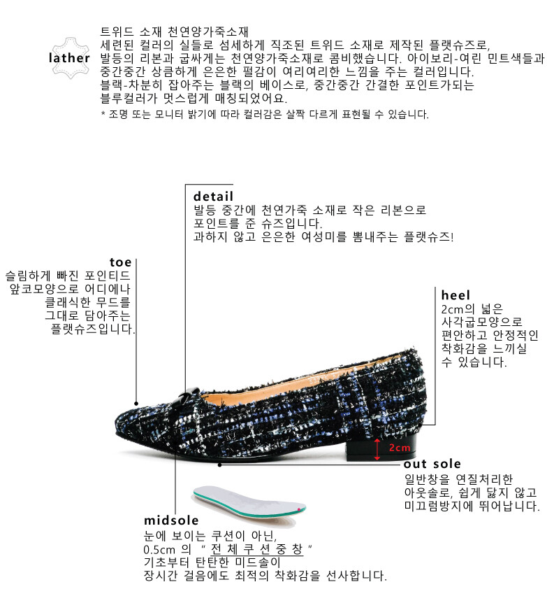 COMMENT 세련된 컬러의 실들로 섬세하게 직조된 트위드 소재로 제작되었으며, 발등의 리본과 굽싸게는 천연양가죽소재로 콤비해 제작된 슈즈입니다. '아이보리'는 여린 민트색들과 중간중간 상큼하게 은은한 펄감이 여리여리한 느낌을 주는 컬러입니다. '블랙'컬러는 차분히 잡아주는 블랙의 베이스로, 중간중간 간결한 포인트가되는 블루컬러가 멋스럽게 매칭되어, 무난히 즐겨신으실 수 있는 컬러랍니다. 슬림하게 빠진 포인티드 앞코모양으로 어디에나 클래식한 무드를 그대로 담아주는 플랫슈즈!