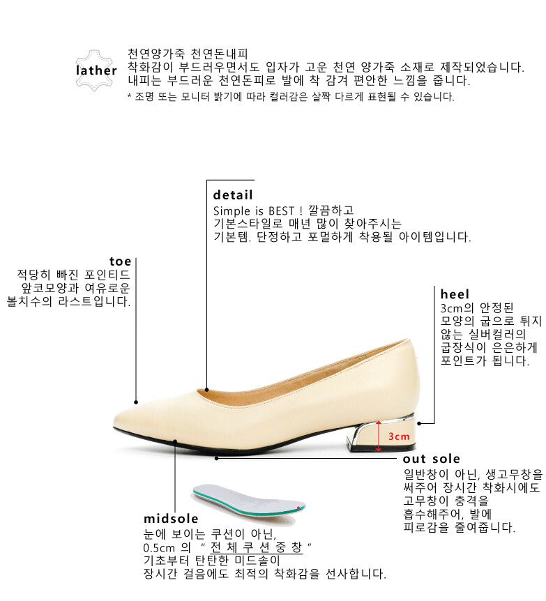 COMMENT Simple is BEST ! 깔끔하고 기본스타일로 매년 많이 찾아주시는 기본템. 단정하고 포멀하게 착용될 기본 플랫슈즈입니다. 외피는 입자가 곱고 부드러운 소재의 양가죽으로, 내피는 천연돈내피로 제작되었어요. 사계절 내내 사용하기 좋으며, 어디에나 어울릴 수 있습니다. 3cm의 안정된 모양의 굽으로 튀지 않는 실버컬러의 굽장식이 은은하게 포인트가 됩니다. 특히 더 편안한 착화감을 느끼실 수 있는 재료로는 아웃솔을 일반창이 아닌, 생고무창을 써주어 장시간 착화시에도 고무창이 충격을 흡수해주어, 발에 피로감을 줄여줍니다. (*모델 착화사진 컬러 : 크림)