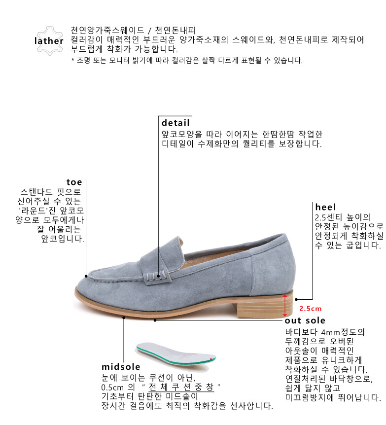 COMMENT 어떻게 매치하느냐에 따라 포멀과 캐주얼을 자유롭게 구사할 수 있는 아우라 있는 로퍼입니다. 컬러감이 매력적인 부드러운 양가죽소재의 스웨이드와, 천연돈내피로 제작되어 부드럽게 착화가 가능합니다. 바디보다 4mm정도의 두께감으로 오버된 아웃솔이 매력적인 제품으로 유니크하게 착화하실 수 있습니다. 연질처리된 바닥창으로, 쉽게 닳지 않고 미끄럼방지에 뛰어납니다. 앞코모양을 따라 이어지는 한땀한땀 작업한 디테일이 수제화만의 퀄리티를 보장합니다.