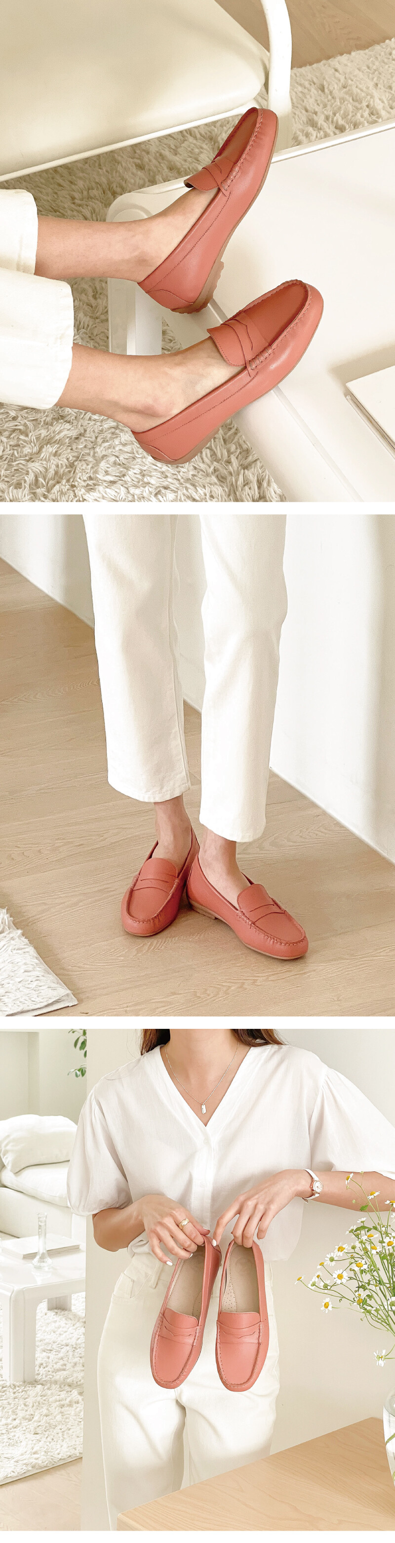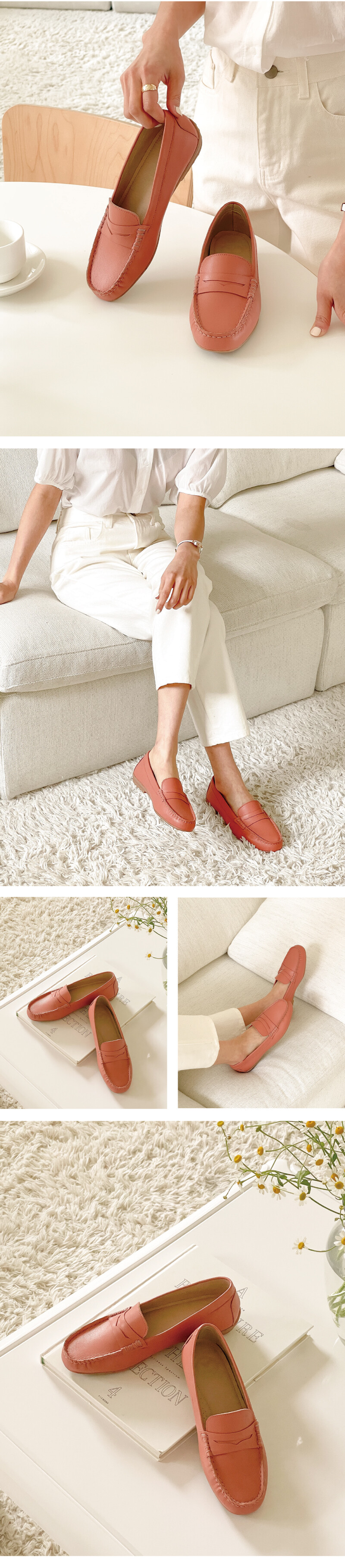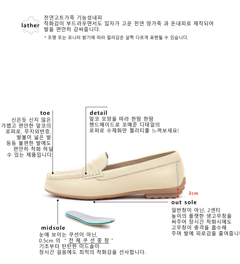 COMMENT 신은듯 신지 않은 가볍고 편안한 앞코의 로퍼로, 무지외반증, 발볼이 넓은 발 등등 불편한 발에도 편안히 착화 하실 수 있는 제품입니다. 착화감이 부드러우면서도 입자가 고운 천연 양가죽 과 돈내피로 제작되어 발을 편안히 감싸줍니다. 앞코 모양을 따라 한땀 한땀 핸드메이드로 꼬매준 디테일의 로퍼로 수제화만 퀄리티를 느껴보세요! 계절을 타지 않으며, 4계절 내내 오래두고 신으실 수 있는 디자인으로 편안함은 기본! 데일리룩에도 잘 어우실 고급스럽고 착화감 좋은 상품으로 강추해드립니다!