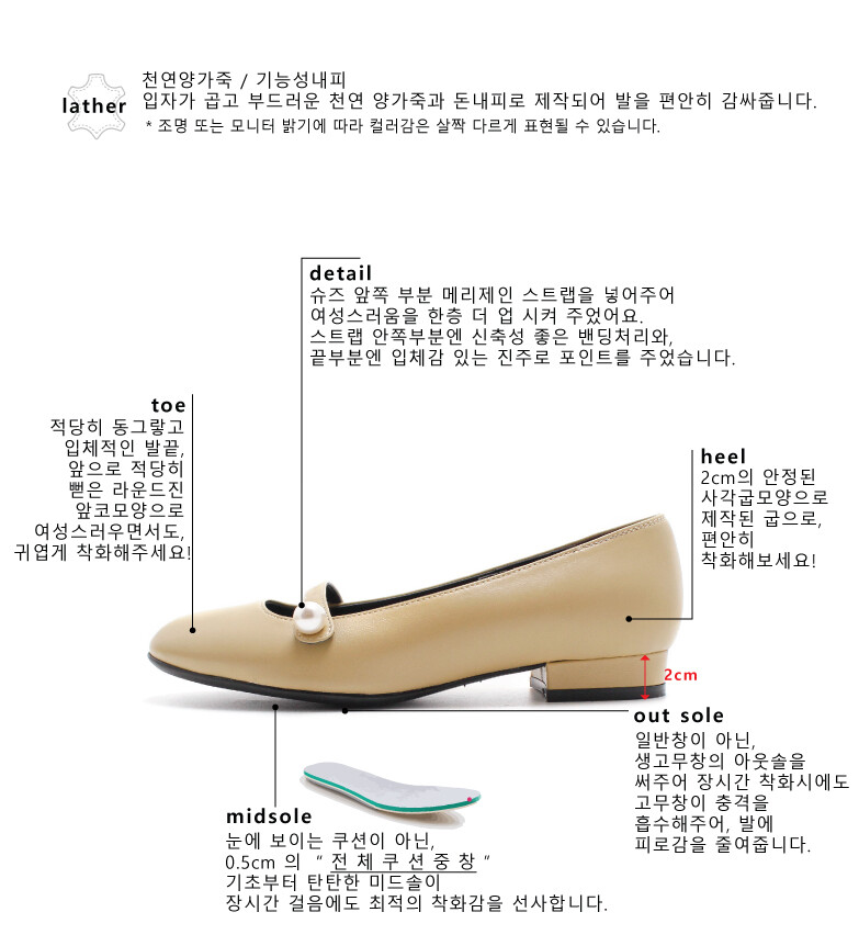 COMMENT 적당히 동그랗고 입체적인 앞코모양의 라운드진 라스트로 제작된 귀여운 플랫슈즈를 소개합니다! 슈즈 앞쪽부분으로 메리제인 스트랩을 넣어주어 여성스러운 느낌까지 더한 플랫슈즈입니다. 입체적인 진주가 포인트가되며, 스트랩 안쪽으론 밴딩처리를 해주어 착화하시기에 편하게 제작되었답니다. 일반창이 아닌, 생고무창의 아웃솔을 써주어 장시간 착화시에도 고무창이 충격을 흡수해주어, 발에 피로감을 줄여줍니다.
