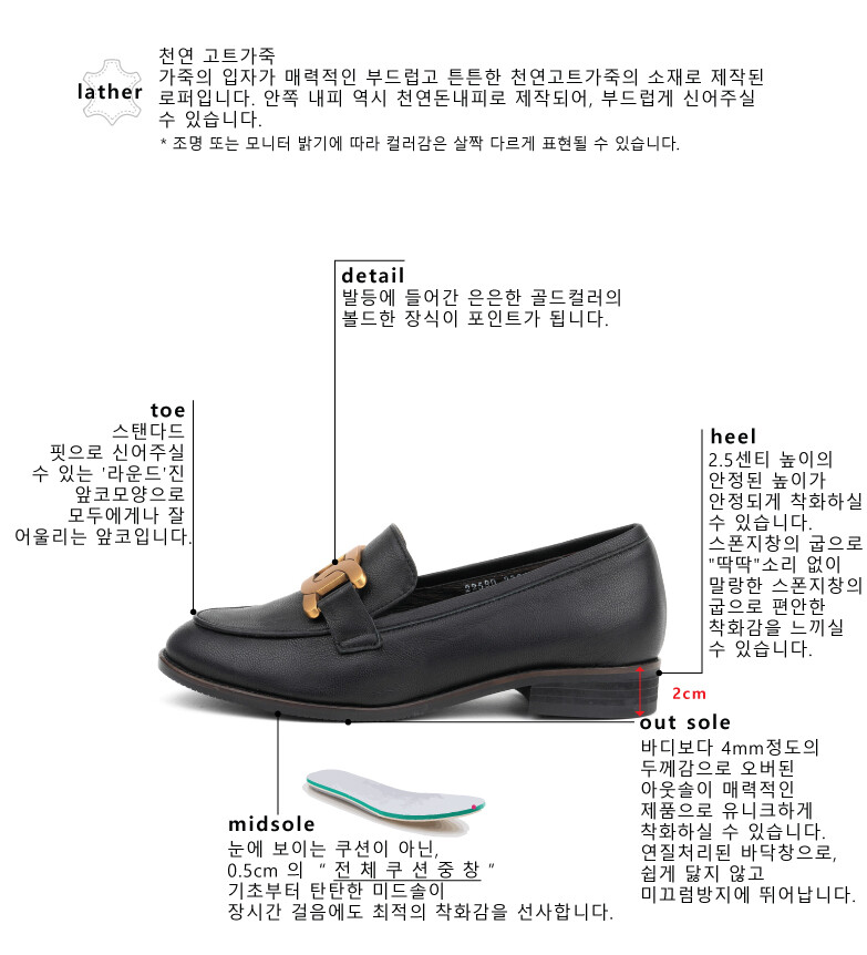 COMMENT 볼드한 체인장식이 포인트가 되는 로퍼를 소개해드려요! 가죽의 입자가 매력적인 부드럽고 튼튼한 천연고트가죽의 소재로 제작된 로퍼입니다. 안쪽 내피 역시 천연돈내피로 제작되어, 부드럽게 신어주실 수 있습니다. 스탠다드 핏으로 신어주실 수 있는 '라운드'진 앞코모양으로 모두에게나 잘 어울리는 앞코입니다. 2.5센티 높이의 안정된 높이가 안정되게 착화하실 수 있습니다. 스폰지창의 굽으로 "딱딱"소리 없이 말랑한 스폰지창의 굽으로 편안한 착화감을 느끼실 수 있습니다. 바디보다 4mm정도의 두께감으로 오버된 아웃솔이 매력적인 제품으로 유니크하게 착화하실 수 있습니다. 연질처리된 바닥창으로, 쉽게 닳지 않고 미끄럼방지에 뛰어납니다.