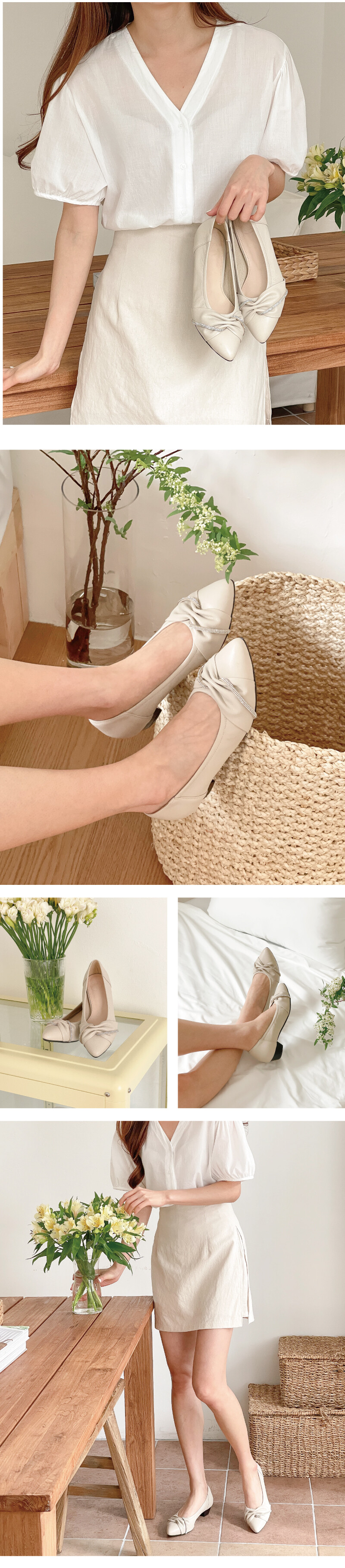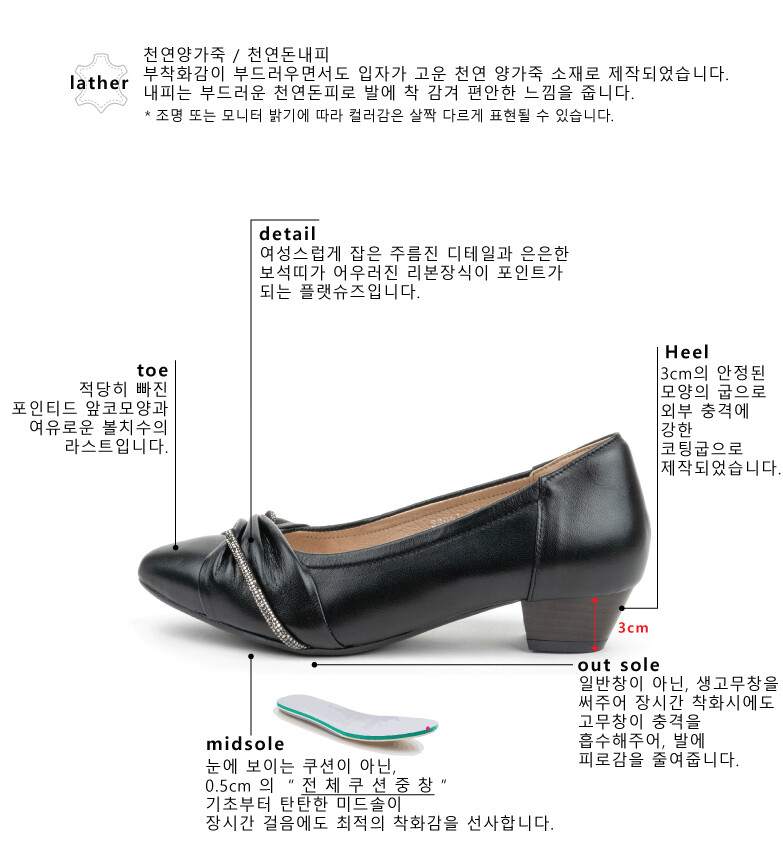 COMMENT 여성스럽게 잡은 주름진 디테일과 은은한 보석띠가 어우러진 리본장식이 포인트가 되는 플랫슈즈입니다. 착화감이 부드러우면서도 입자가 고운 천연 양가죽 소재로 제작되었습니다. 내피는 부드러운 천연돈피로 발에 착 감겨 편안한 느낌을 줍니다. 적당히 빠진 포인티드 앞코모양과 여유로운 볼치수로 제작되었어요. 3cm의 안정된 모양의 굽으로 외부 충격에 강한 코팅굽으로 제작되었습니다. 일반창이 아닌, 생고무창을 써주어 장시간 착화시에도 고무창이 충격을 흡수해주어, 발에 피로감을 줄여줍니다.