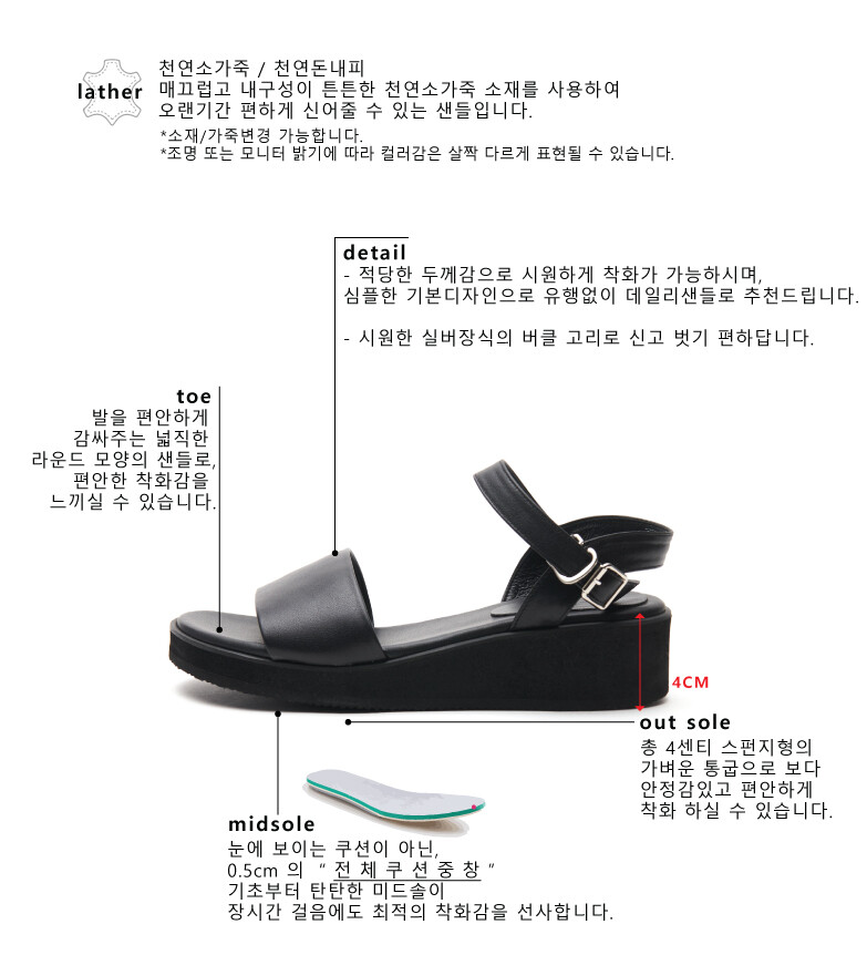 COMMENT 튼튼한 천연소가죽으로, 시원하게 신어줄 기본스타일의 가벼운 통굽샌들을 소개해드려요! 매끄럽고 내구성이 튼튼한 천연소가죽 소재를 사용하여 오랜기간 편하게 신어줄 수 있는 샌들입니다. 발을 편안하게 감싸주는 넓직한 라운드 모양의 샌들로, 편안한 착화감을 느끼실 수 있습니다. 적당한 두께감으로 시원하게 착화가 가능하시며, 심플한 기본디자인으로 유행없이 데일리샌들로 추천드립니다. 시원한 실버장식의 버클 고리로 신고 벗기 편하답니다. 총 4센티 스펀지형의 가벼운 통굽으로 보다 안정감있고 편안하게 착화 하실 수 있습니다.