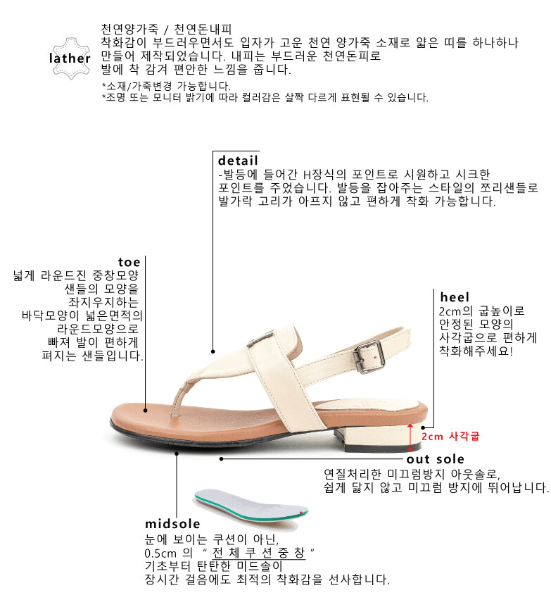 COMMENT 발등에 시원한 에이치 장식이포인트로 들어간 쪼리 샌들 소개합니다! 착화감이 부드러우면서도 입자가 고운 천연 양가죽 소재로 얇은 띠를 하나하나 만들어 제작되었습니다. 내피는 부드러운 천연돈피로 발에 착 감겨 편안한 느낌을 줍니다. 넓게 라운드진 중창모양 샌들의 모양을 좌지우지하는 바닥모양이 넓은면적의 라운드모양으로 빠져 발이 편하게 펴지는 샌들입니다. 발등에 들어간 H장식의 포인트로 시원하고 시크한 포인트를 주었습니다. 발등을 잡아주는 스타일의 쪼리샌들로 발가락 고리가 아프지 않고 편하게 착화 가능합니다. 2cm의 굽높이로 안정된 모양의 사각굽으로 편하게 착화해주세요! 연질처리한 미끄럼방지 아웃솔로, 쉽게 닳지 않고 미끄럼 방지에 뛰어납니다.